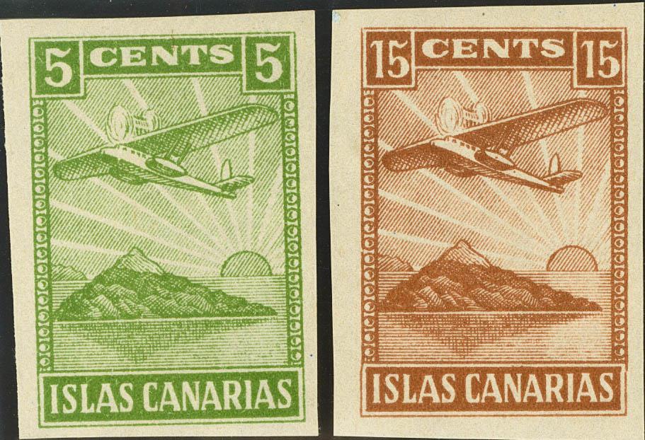 English ★★/★ 82. (1938ca). 5 cts apple green and 15 cts chestnut, both RARE and imprinted. CANARY ISLANDS. MAGNIFICENT AND RARE. (Allepuz 9, 10, Fesofi 2s, 3s)