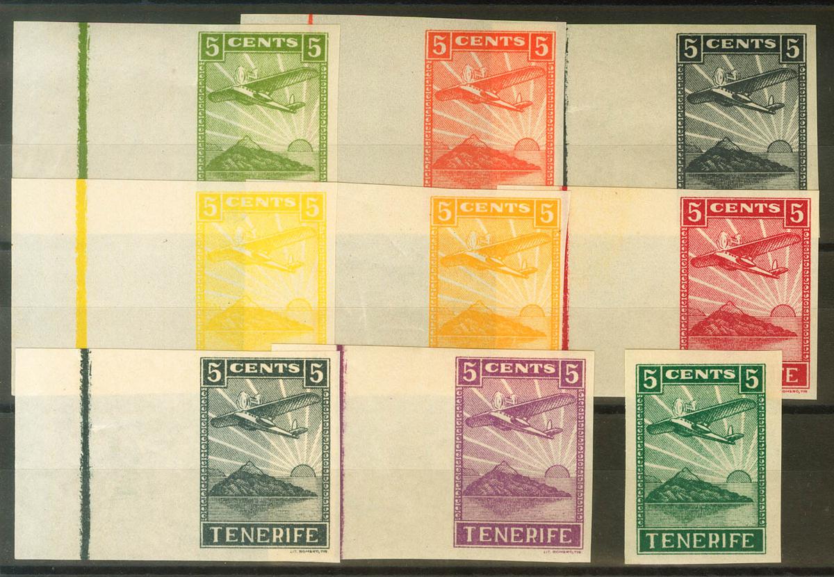 ★★/★(1938ca). Set of nine stamps of 5 cts WITHOUT IMPRESSION in different colors, plus a 5 cts without imprint. TENERIFE (CANARY ISLANDS). MAGNIFICENT AND RARE. (Allepuz 11/18, Fesofi 12, 14/20)