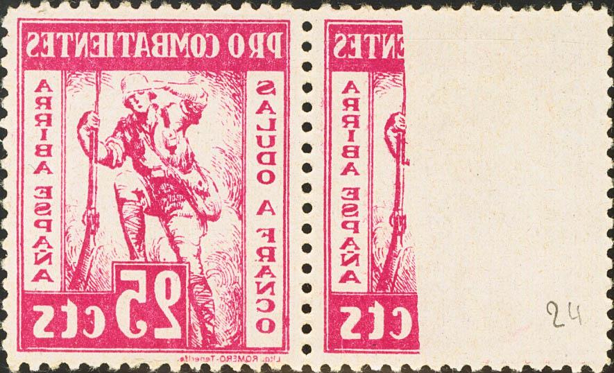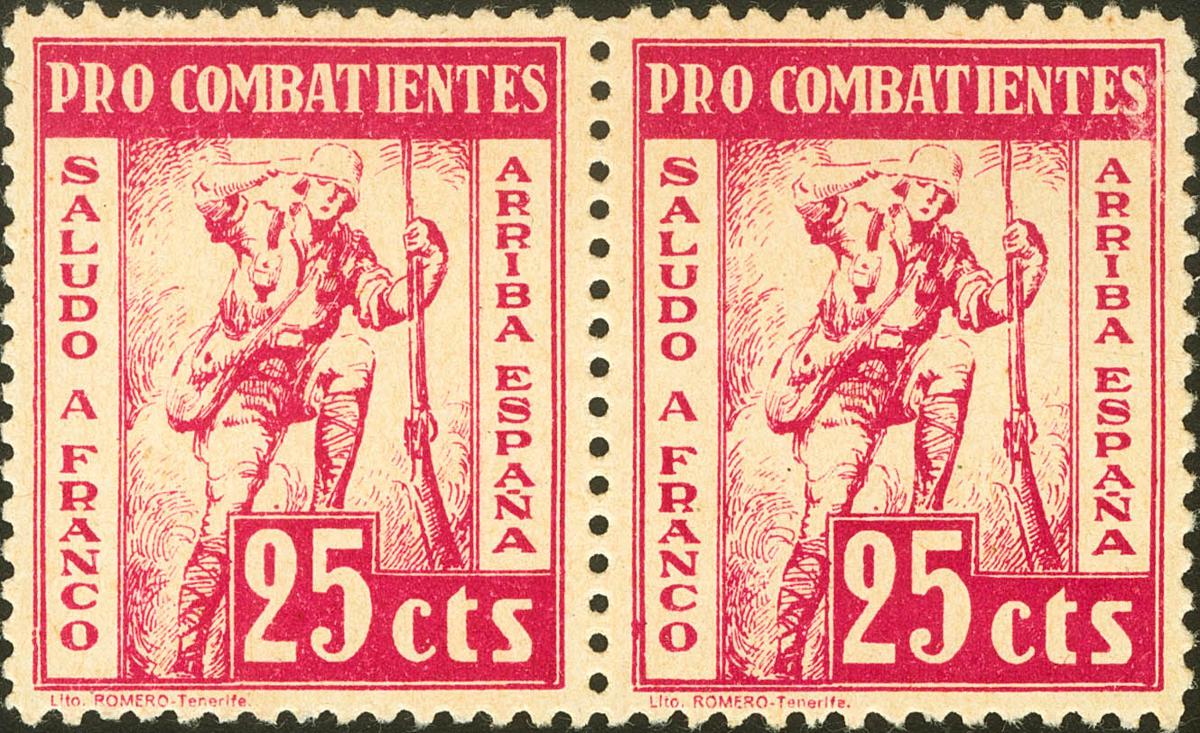 ★★(1937ca). 25 cts lilac pink TRACES ON THE BACK, ONE PARTIAL IMPRESSION STAMP, pair. CANARY ISLANDS. MAGNIFICENT AND RARE.