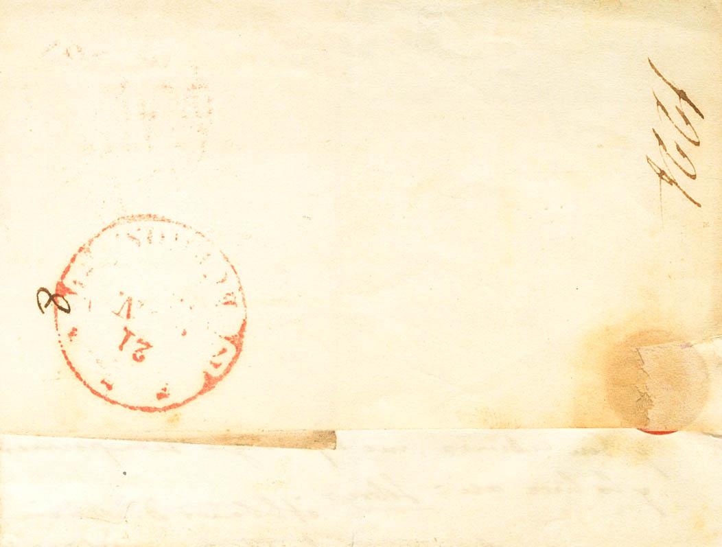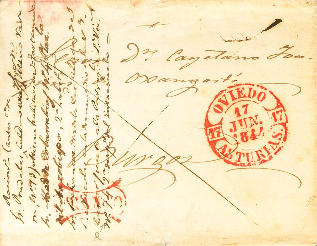 1844. OVIEDO to BURGOS. Baeza OVIEDO / ASTURIAS and FRANCO brand, both in red (PE18) 2004 edition. MAGNIFICENT AND RARE.