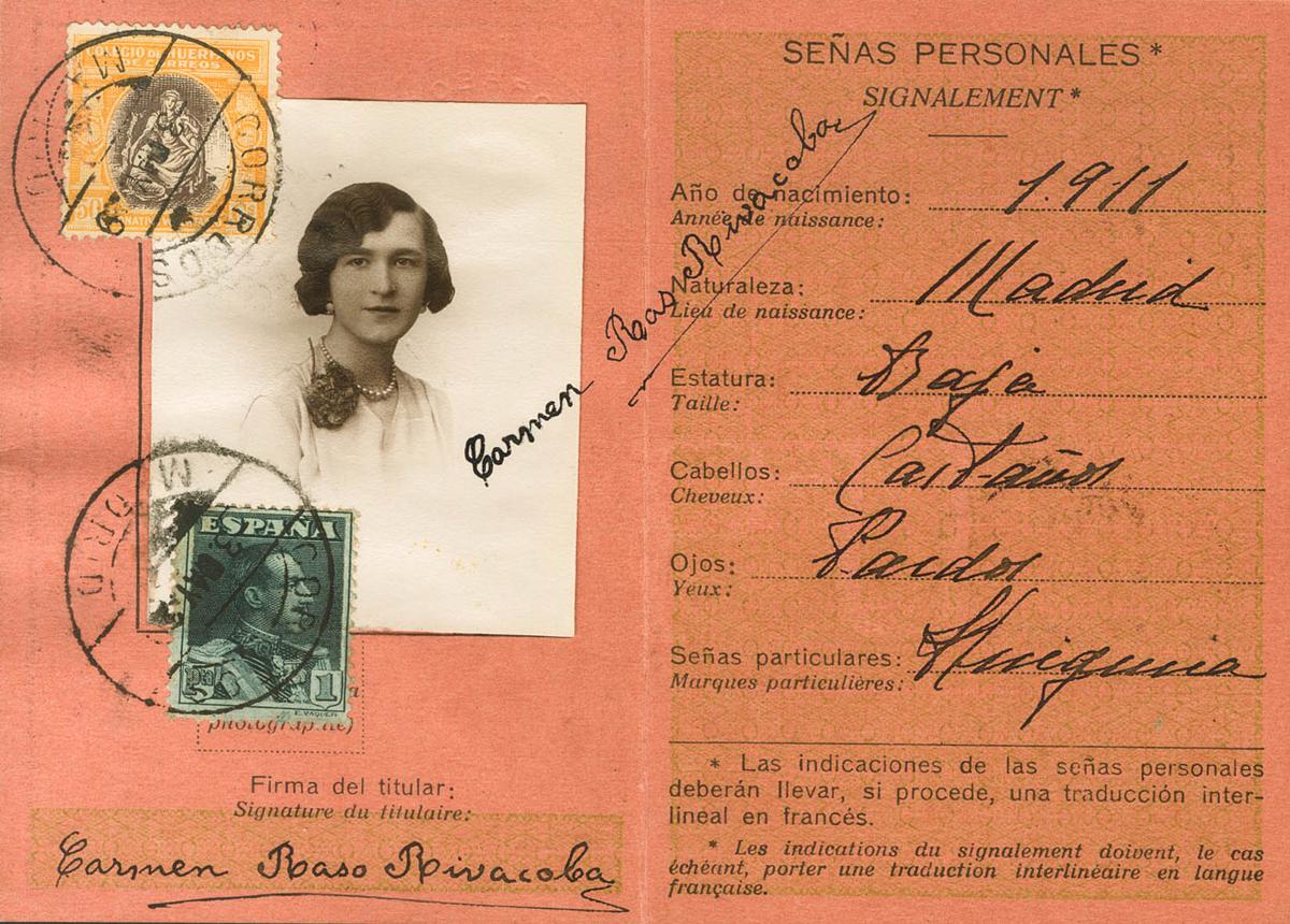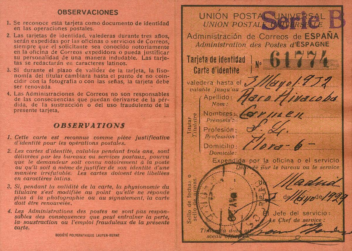 English 321. 1929. 1 slate pts and 50 yellow and sepia cts for Charity. Identity Card of the Universal Postal Union with dater CORREOS / MADRID. MAGNIFICENT AND RARE WITH THE SEAL OF CHARITY.