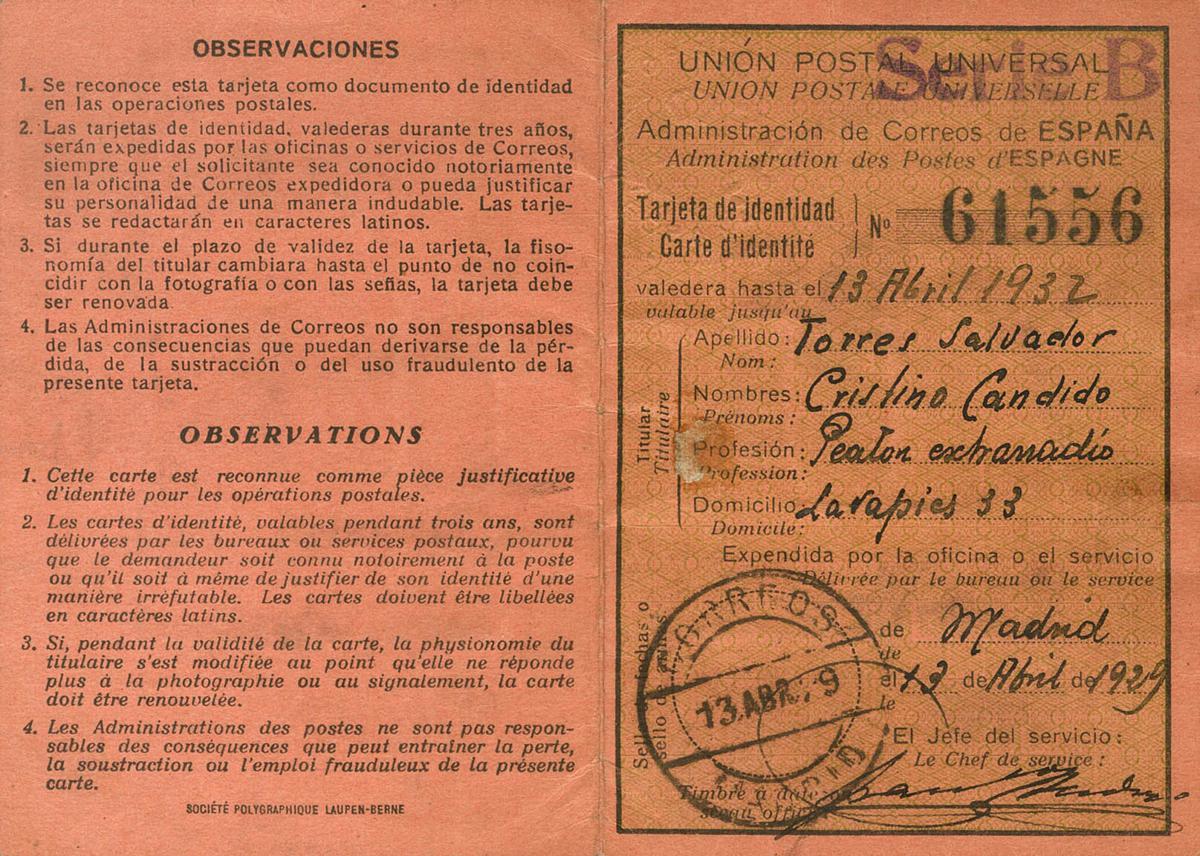 English △ 1929. Universal Postal Union Identity Card with CORREOS / MADRID dater. MAGNIFICENT.