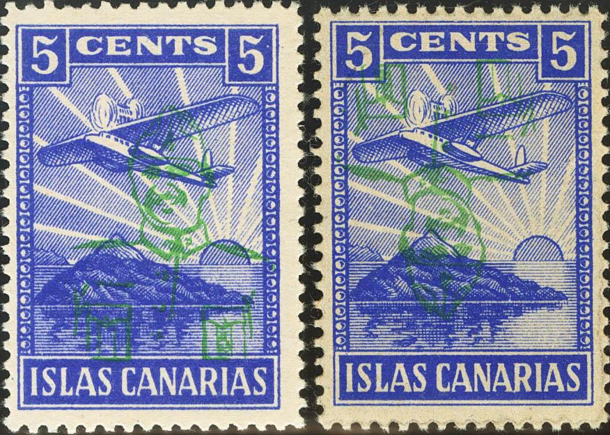 ★(1938ca). 5 cts blue violet, two stamps, one with INVERTED SURCHARGE, in green. CANARY ISLANDS. MAGNIFICENT. (Allepuz 51, 51hi, Fesofi 26, 26i)