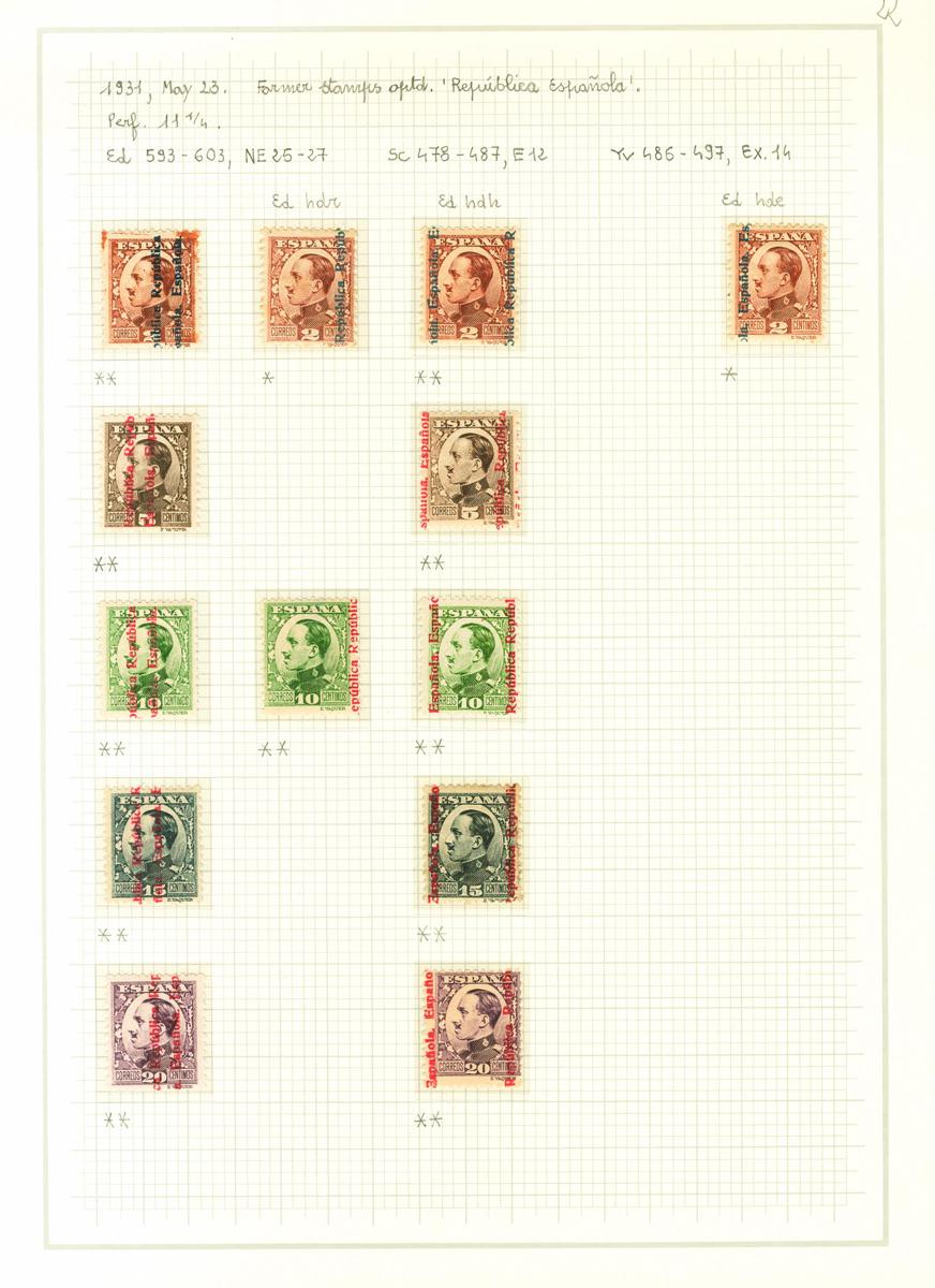 ★★/ 593/02. 1931. Interesting and spectacular set of stamps from the first issue of the Second Republic, in new and used, includes numerous varieties of overload, such as displaced, on horseback, some numbering variety and some block. MAGNIFICENT AND SPECTACULAR ASSEMBLY OF ENORMOUS INTEREST, HIGHLIGHTS THE STUDY, PROBABLY UNIQUE OF THE OVERLOADS "ON HORSE".