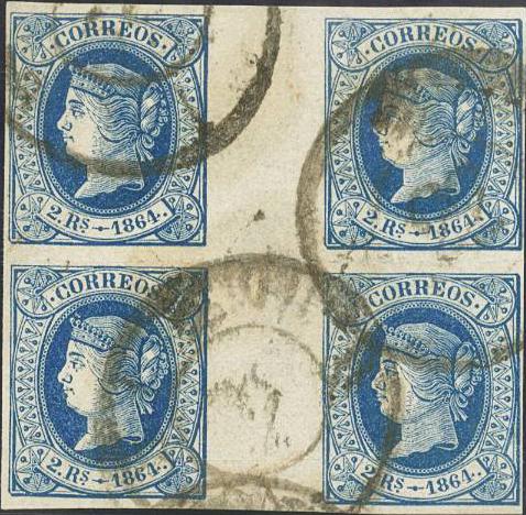 English 68(4). 1864. 2 reales blue, block of four with INTERPANEL. MAGNIFICENT AND EXTRAORDINARILY RARE, ONLY KNOWN WITH THE 2 REALS OF THIS ISSUE. Certificate GRAUS.