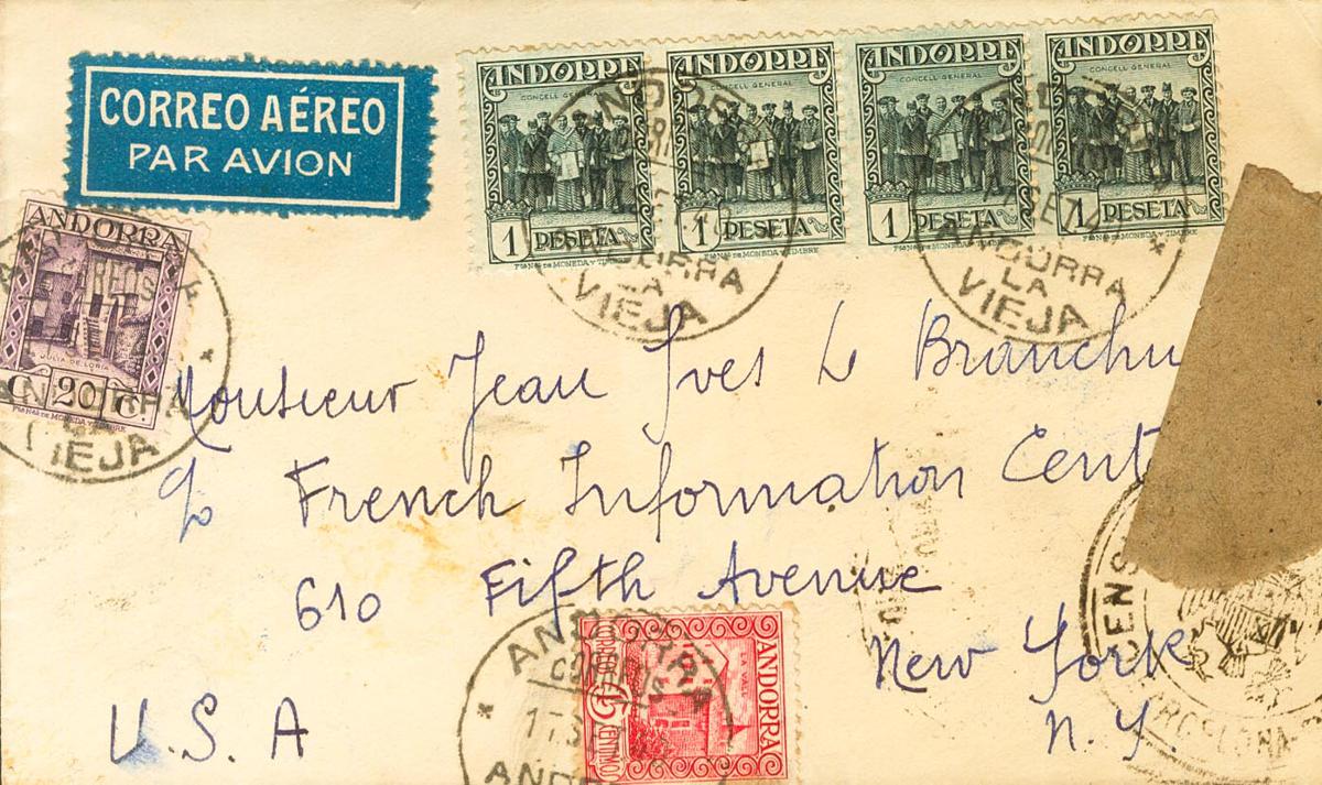 34, 38, 24d(4). 1940. 20 violet cts, 45 pink cts and 1 slate pts. ANDORRA THE OLD to NEW YORK (USA). On the back transit. MAGNIFICENT AND UNUSUAL POSTAGE.