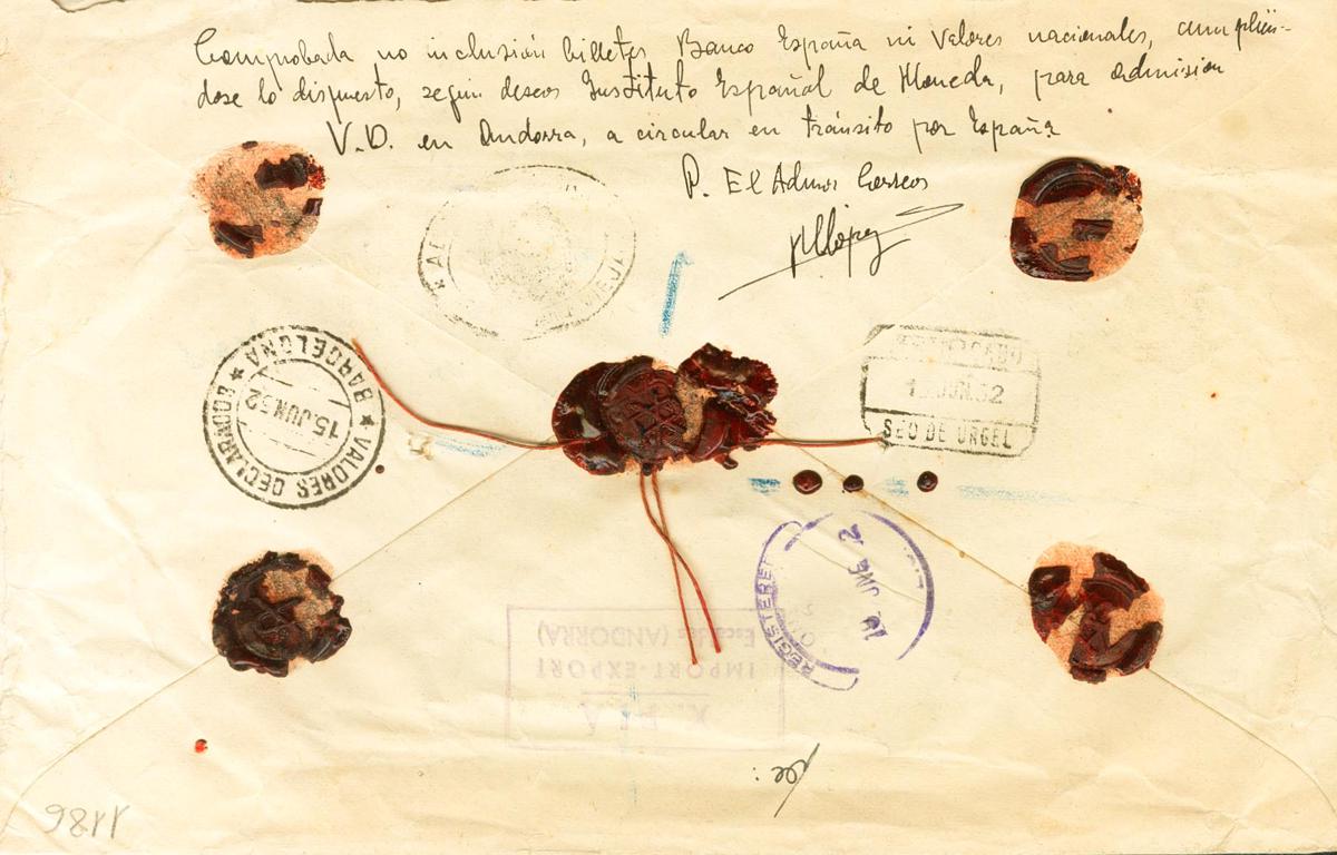 English 51, 54(3), 43(3). 1952. 50 green cts, 1 red pts, three stamps, 10 chestnut pts from 1935, three stamps and 4 pink pts from Spain. Declared Values from ANDORRA LA VIEJA to LONDON (GREAT BRITAIN). On the back arrival. MAGNIFICENT AND SPECTACULAR AND RARE POSTAGE.