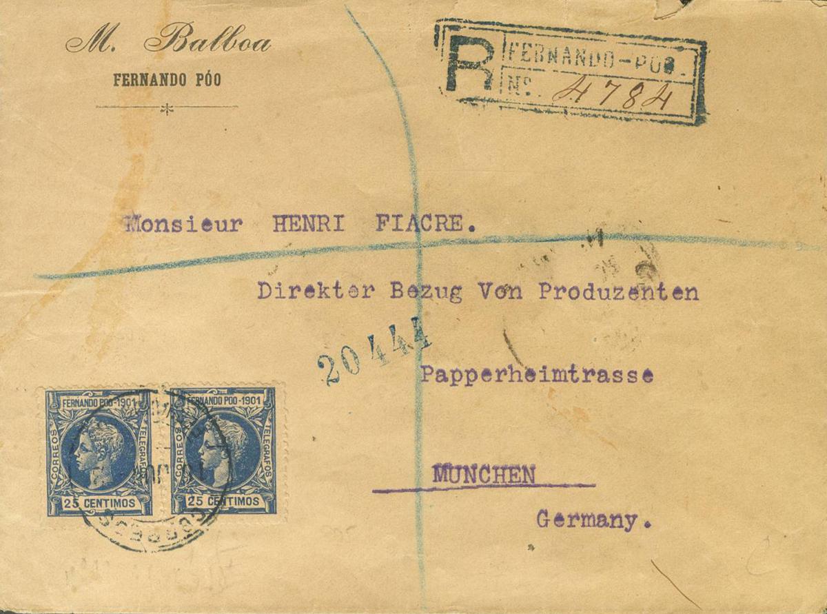 101(2). 1902. 25 cts blue, pair. Certificate from FERNANDO POO to MUNICH (GERMANY), circulated via England. On the back arrival. MAGNIFICENT.