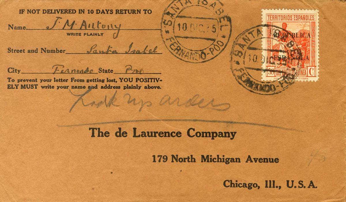 225. 1935. 50 orange cts. SANTA ISABEL to CHICAGO (USA). Postmark SANTA ISABEL / FERNANDO POO. MAGNIFICENT.
