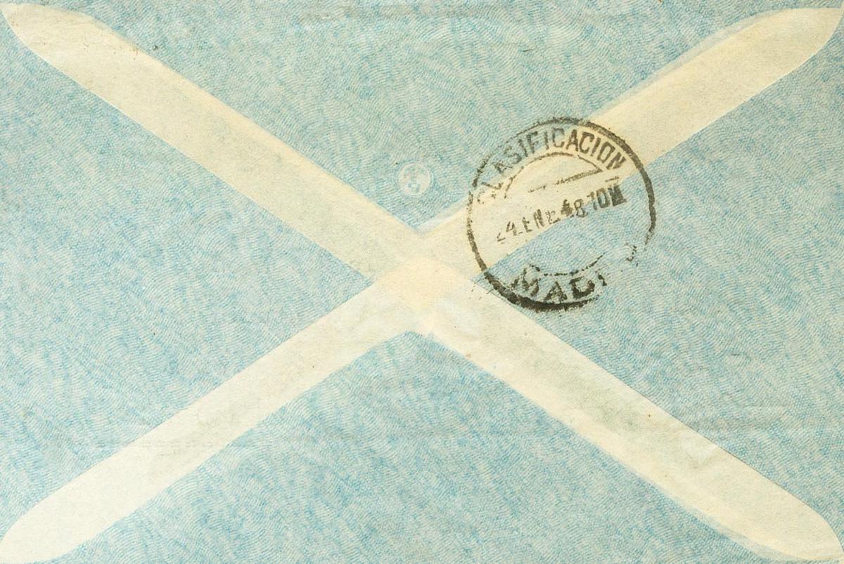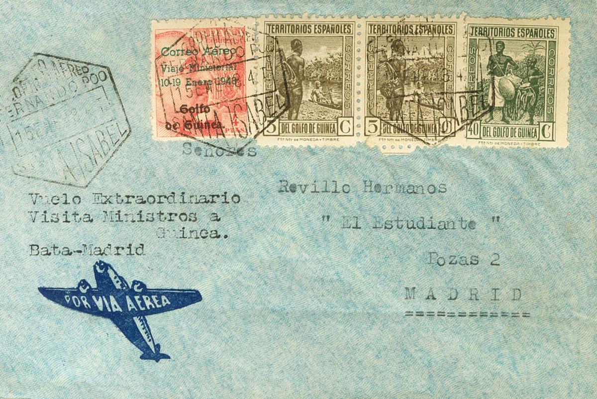 272, 264(2), 266. 1948. 4 pts pink, 5 cts chestnut, two stamps and 40 cts gray green. Airmail from SANTA ISABEL to MADRID. On the front typed text "EXTRAORDINARY FLIGHT VISIT MINISTERS TO GUINEA BATA-MADRID", arrival on the back. MAGNIFICENT.