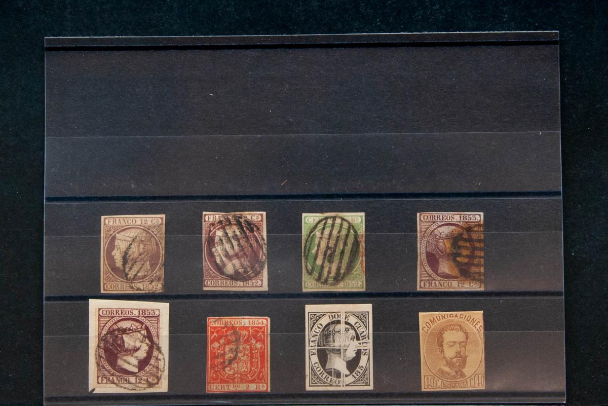 (1852ca). Set of stamps of the 12 cuartos and 5 reales of 1852, 12 cuartos of 1853 and 2 reales of 1854, used, including a Limada punch proof of the 12 cuartos of 1851 and Amadeo's 40 cts COLOR ESSAY. TO EXAMINE.