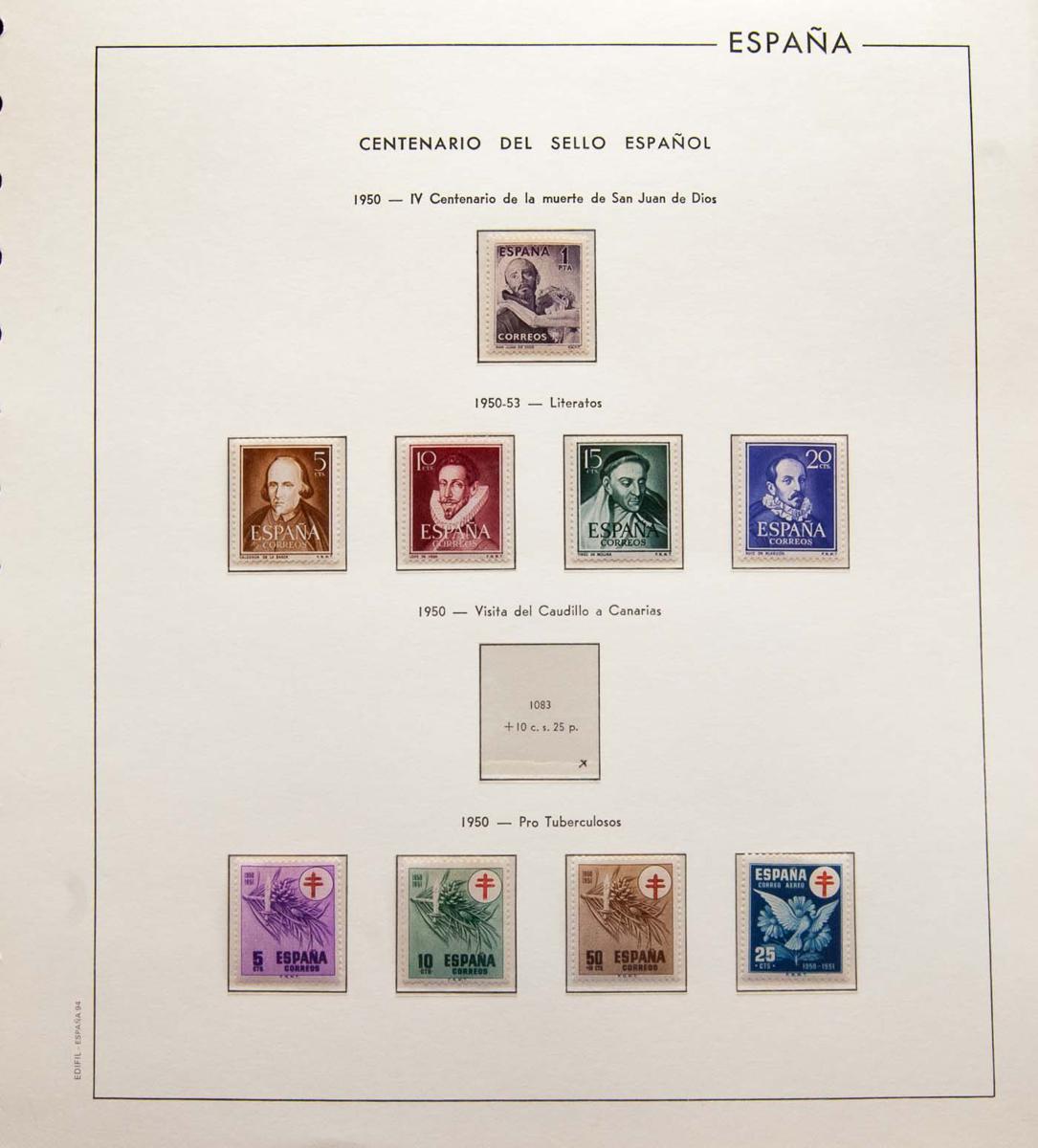 ★★(1950ca). Interesting and practically complete collection between 1950 and 1999, in new condition without affixed stamps, only missing the Canarias without number, Canarias Terrestre (both) and "Legazpi and Sorolla", including the Centenario, Caudillo a Canarias with number, set of Tests between 1975 and 1999 (with Calella and Autonomies), most of the issued mini-sheets (except basic MP1A/C) and the Cards and Postal Stationery of those years (very good quality in general). VERY HIGH CATALOG VALUE. TO EXAMINE.