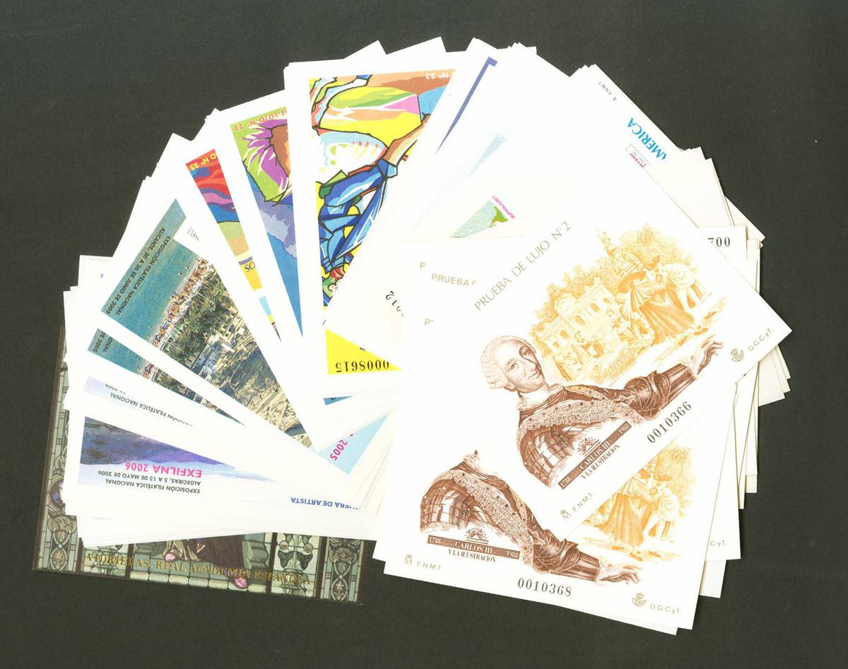 ★★(1988ca). Set of fifty-four Luxury Tests between 1988 and 2007, with repetitions between one and six units of each, highlighting four of each from Carlos III and the Post Office. TO EXAMINE. Edifil 2022: 1,045 Euros