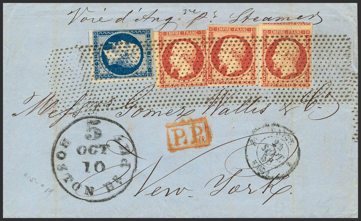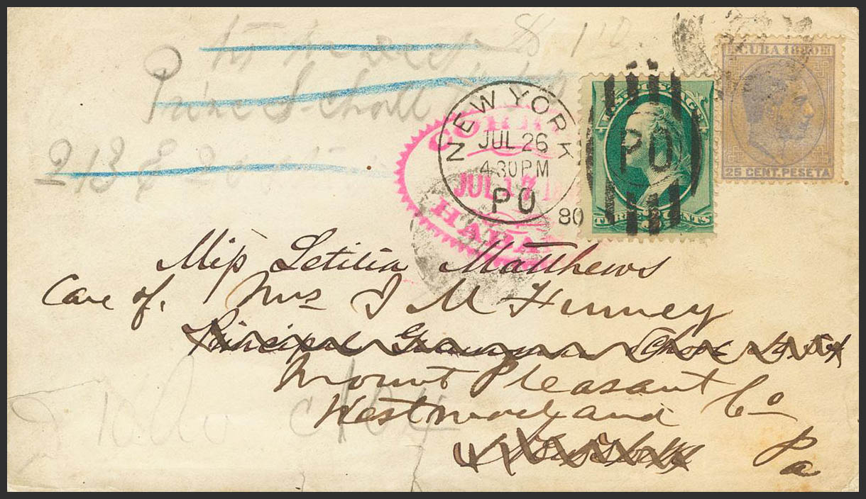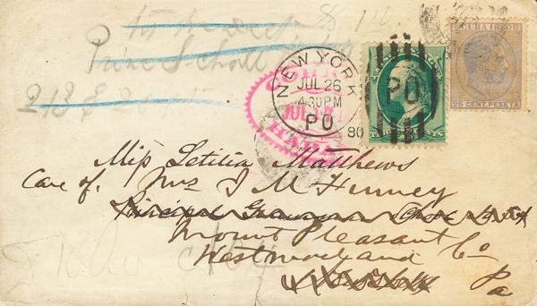 ✉ 1851. NEWPORT (U.S.A.) a MATANZAS. Fechador NEWPORT / R.I., marcas PAID / 10, en rojo y N.A., en azul. MAGNIFICA Y RARA.