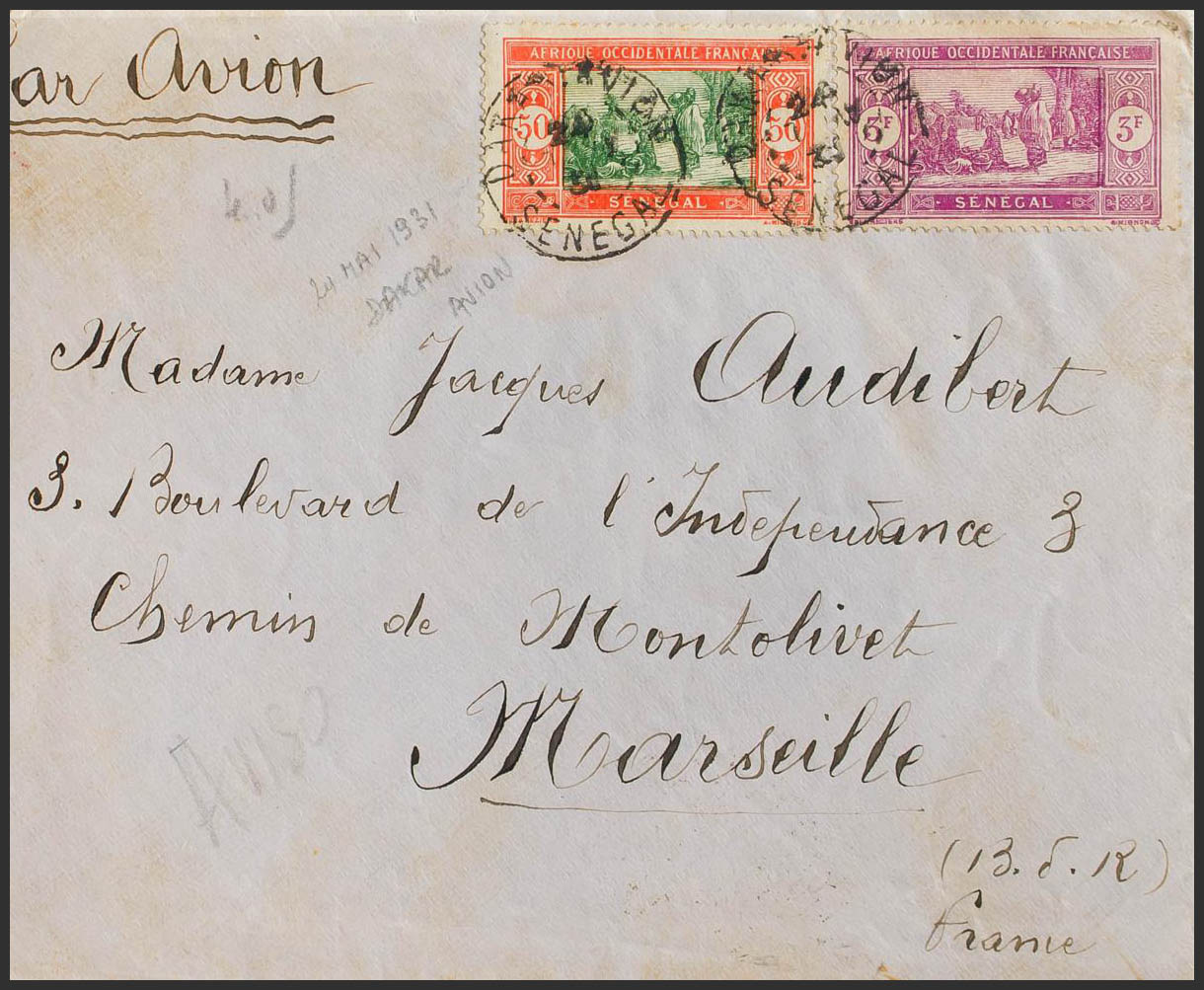 Yvert 82, 109. 1931. 50 cts orange and green and 3 fr lilac. Airmail from DAKAR to MARSEILLE (FRANCE). Submitted by a mechanic from Compania Aeropostale 1, arrival back. MAGNIFICENT.