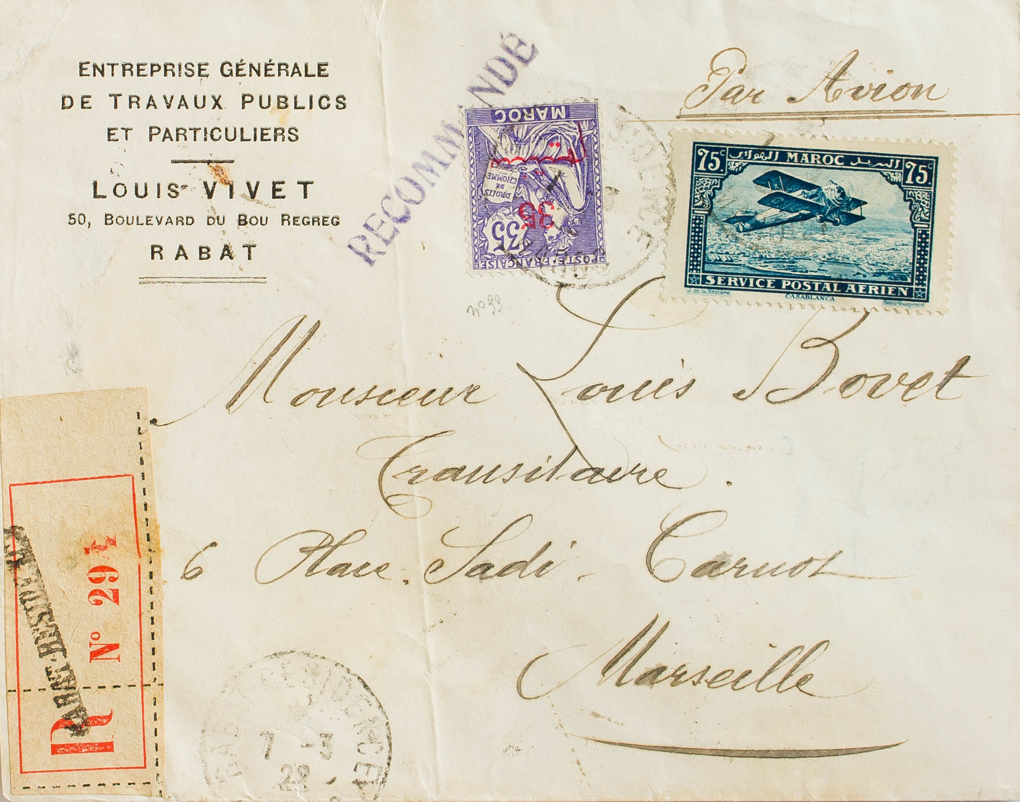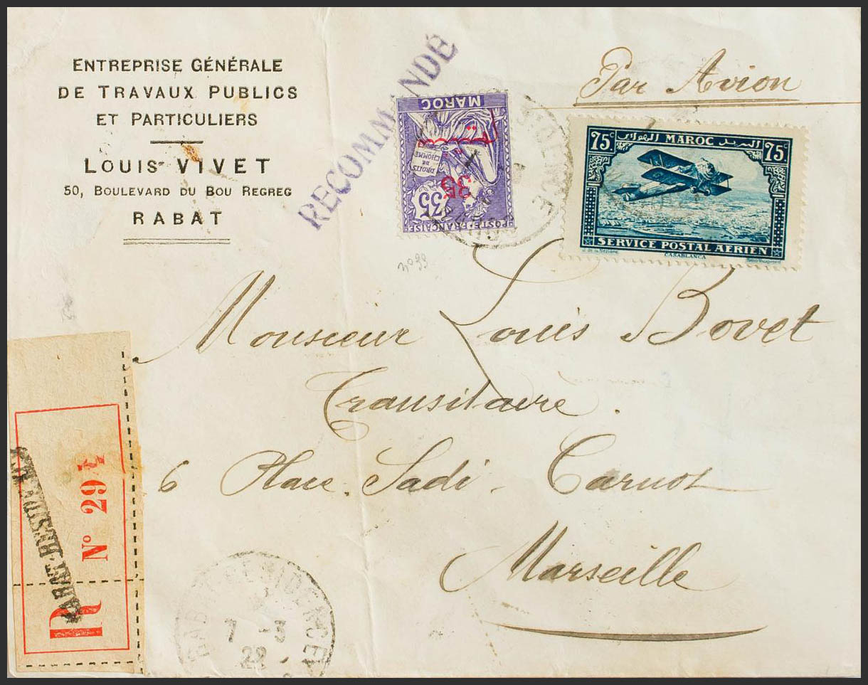 Yvert 47, Aerial 4. 1922. 35 cts over 35 cts violet and 75 cts blue. Air Certificate from RABAT to MARSEILLE (FRANCE). On the back arrival. MAGNIFICENT AND RARE, THE VALUE OF 75 CTS BLUE ON CARD.