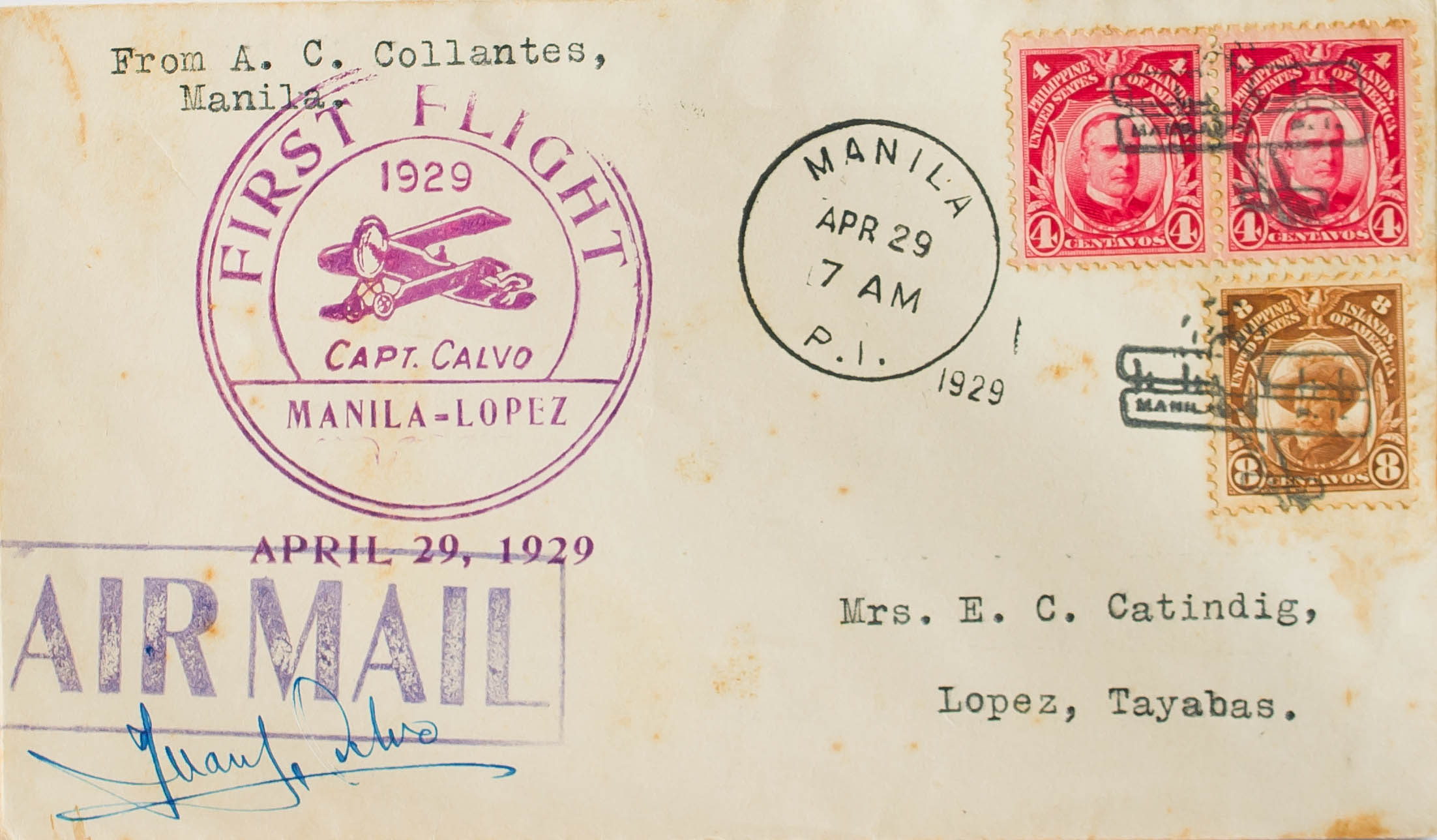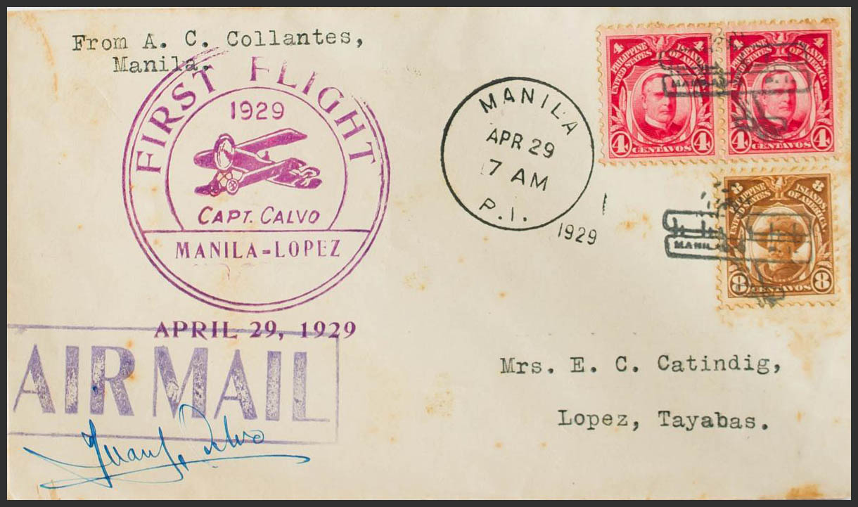 Yvert 205A(2), 207A. 1929. 4 cents carmine, two stamps and 8 cents chestnut (slightly toned). Airmail from MANILA to TAYABAS. On the front brand FIRST FLIGHT / CAPT. CALVO / MANILA-LOPEZ, in violet and the aviator's signature, arrival back. PRETTY.