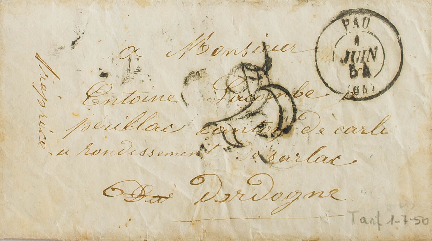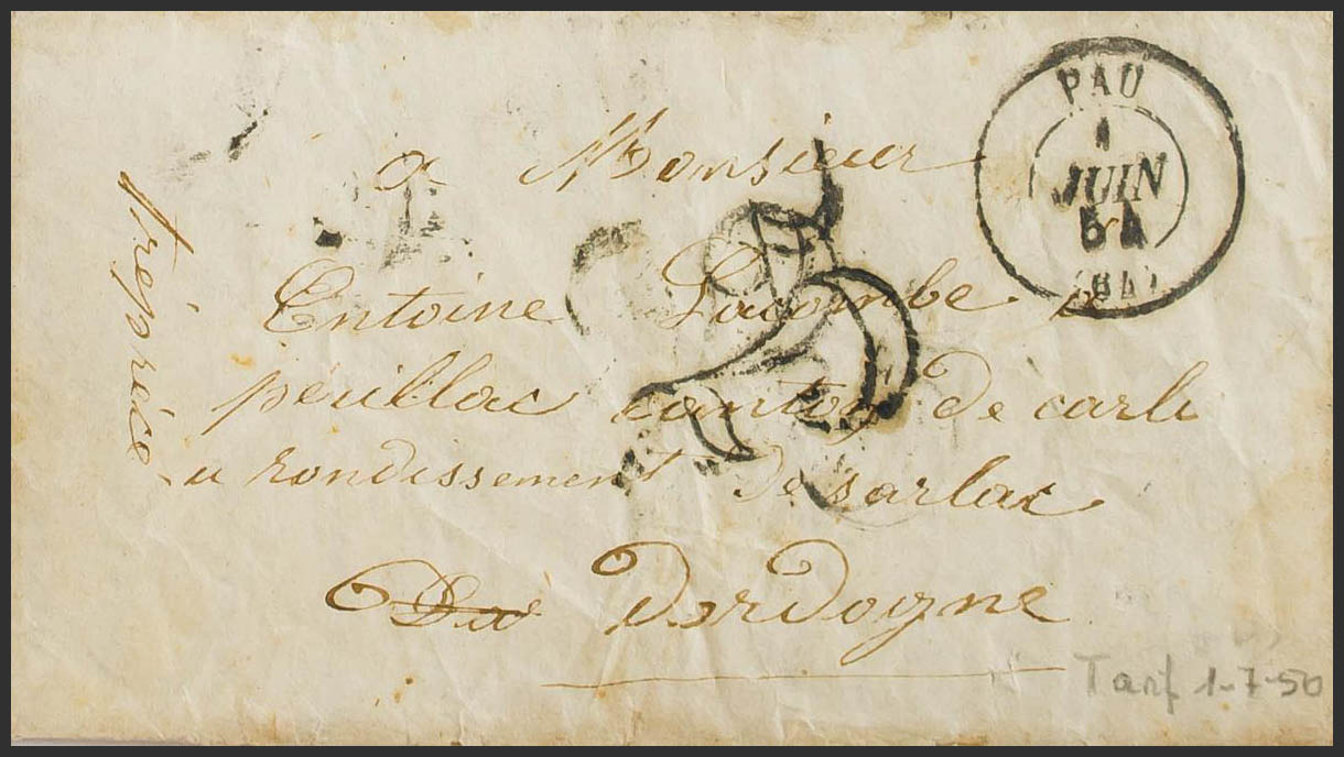 1854. PAU to SARLAT. Portages "2" and "5", perhaps applied individually to form a portage of 25 cts, unusual CARLUX "Pointillé" transit dater on the back. PRETTY.