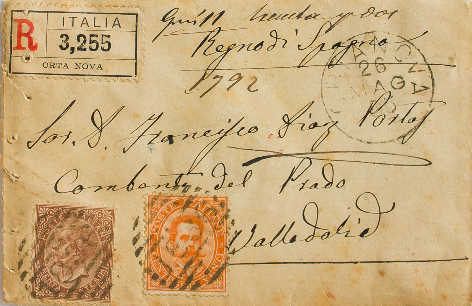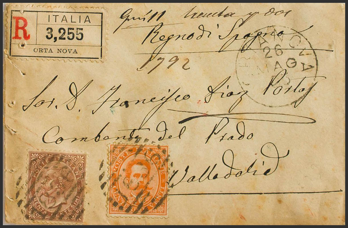 Yvert 18, 35. 1885. 30c chestnut and 20c orange. Certificate from ORTA NOVA to VALLADOLID. Grill numeral "1836" postmark, on the back transits and arrival CERTIFICATE / VALLADOLID, in blue. MAGNIFICENT AND RARE DESTINATION. (Sasson T19, 39)
