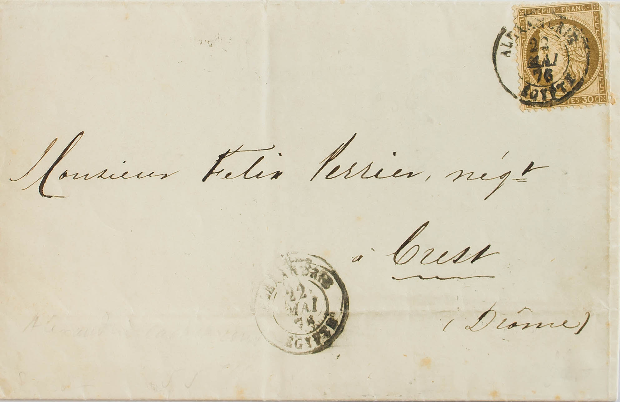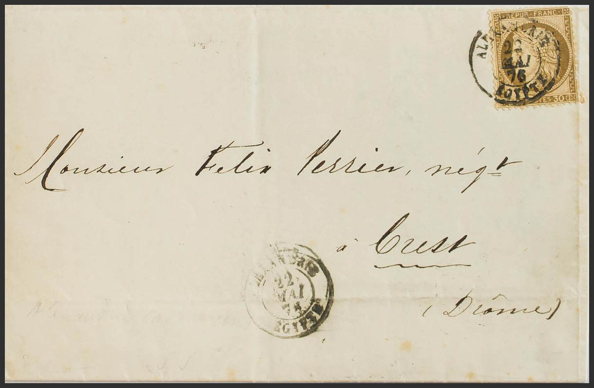 Yvert France 56. 1876. France stamp of 30 brown cts. ALEXANDRIA to CREST (FRANCE). Date postmark ALEJANDRIE / EGYPTE. MAGNIFICENT AND RARE.