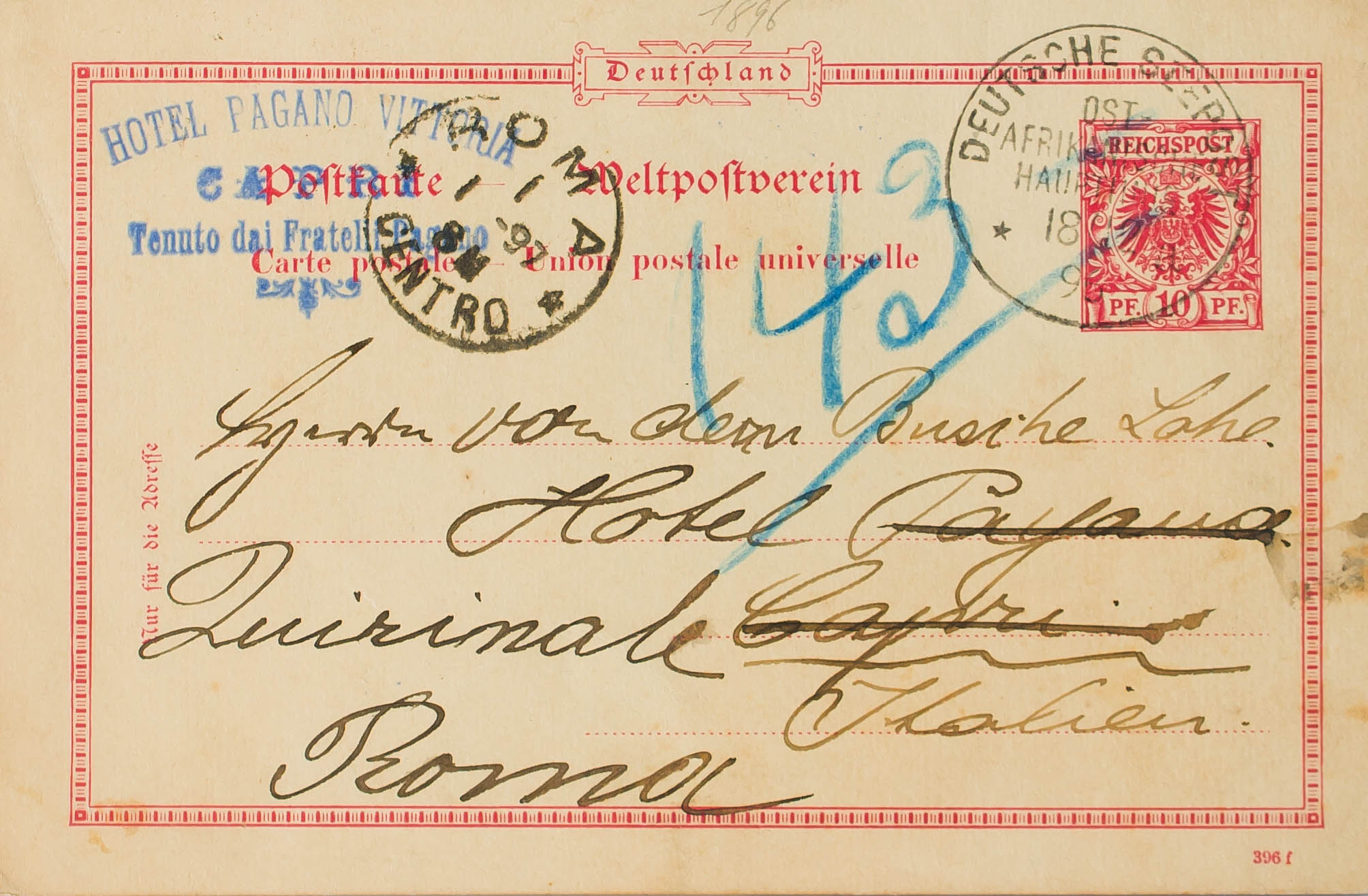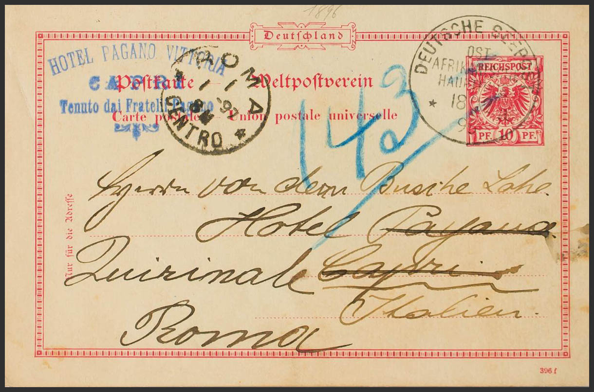 1879. 10 pf pink envelope Postal from ADEN to CAPRI (Hotel Pagano) and forwarded to ROME. Deposited in a German vessel, postmark DEUTSCHE SEE POST / OST / AFRIKANISCHE / HAUPTLINIE. MAGNIFICENT.
