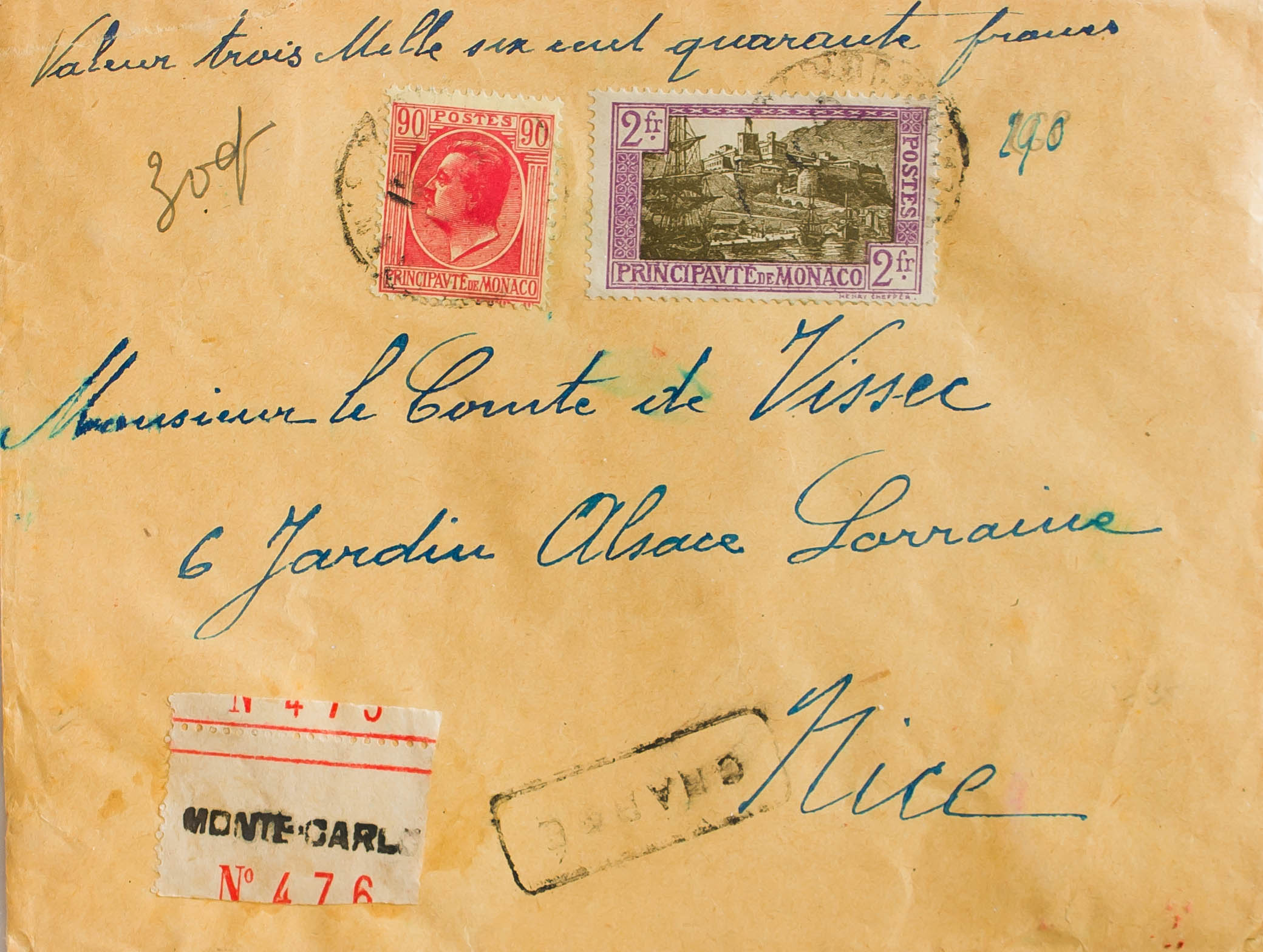 Yvert 94, 100. 1897. 90 cts rose and 2 fr lilac rose and chestnut. Declared Value from MONTE CARLO to NICE. MAGNIFICENT.