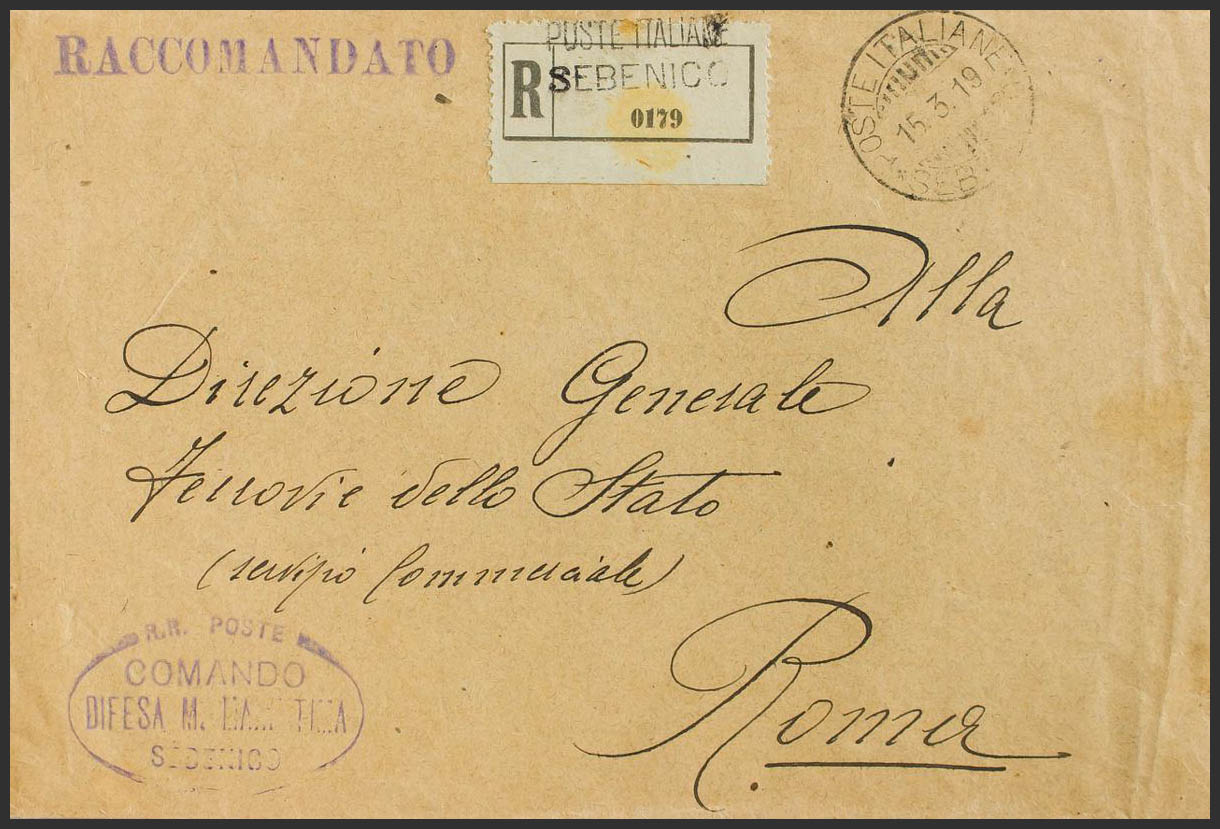 1919. Certificate from SEBENICO to ROME. POSTE ITALIANE / SEBENICO postmark and RR POSTE / COMANDO / DIFESA M. MARITIMA / SEBENICO mark, in violet. MAGNIFICENT AND RARE.