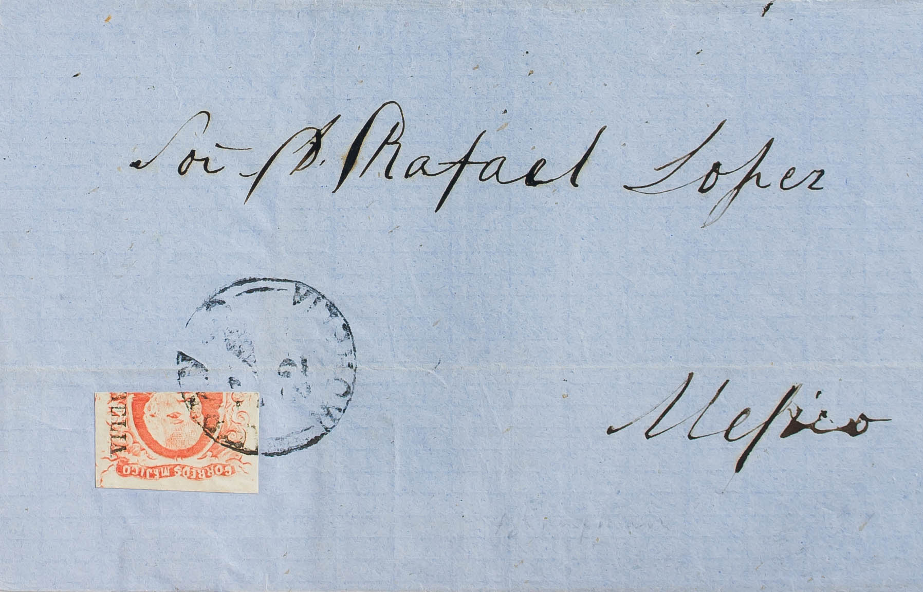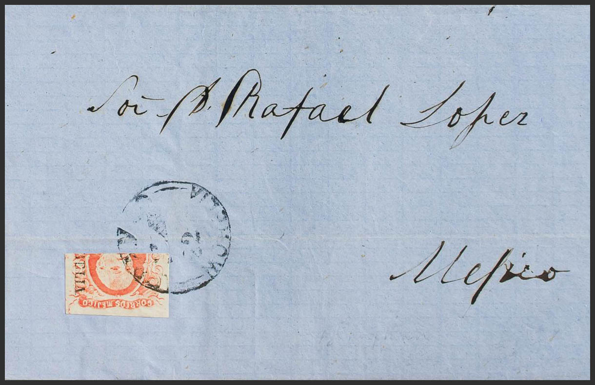 Yvert 4b. 1860. 4 reales red BISECTED. MORELIA to MEXICO. Postmark FRANCO / MORELIA (Schatzkes 901). MAGNIFICENT AND RARE. Yvert 2010: 600 Euros