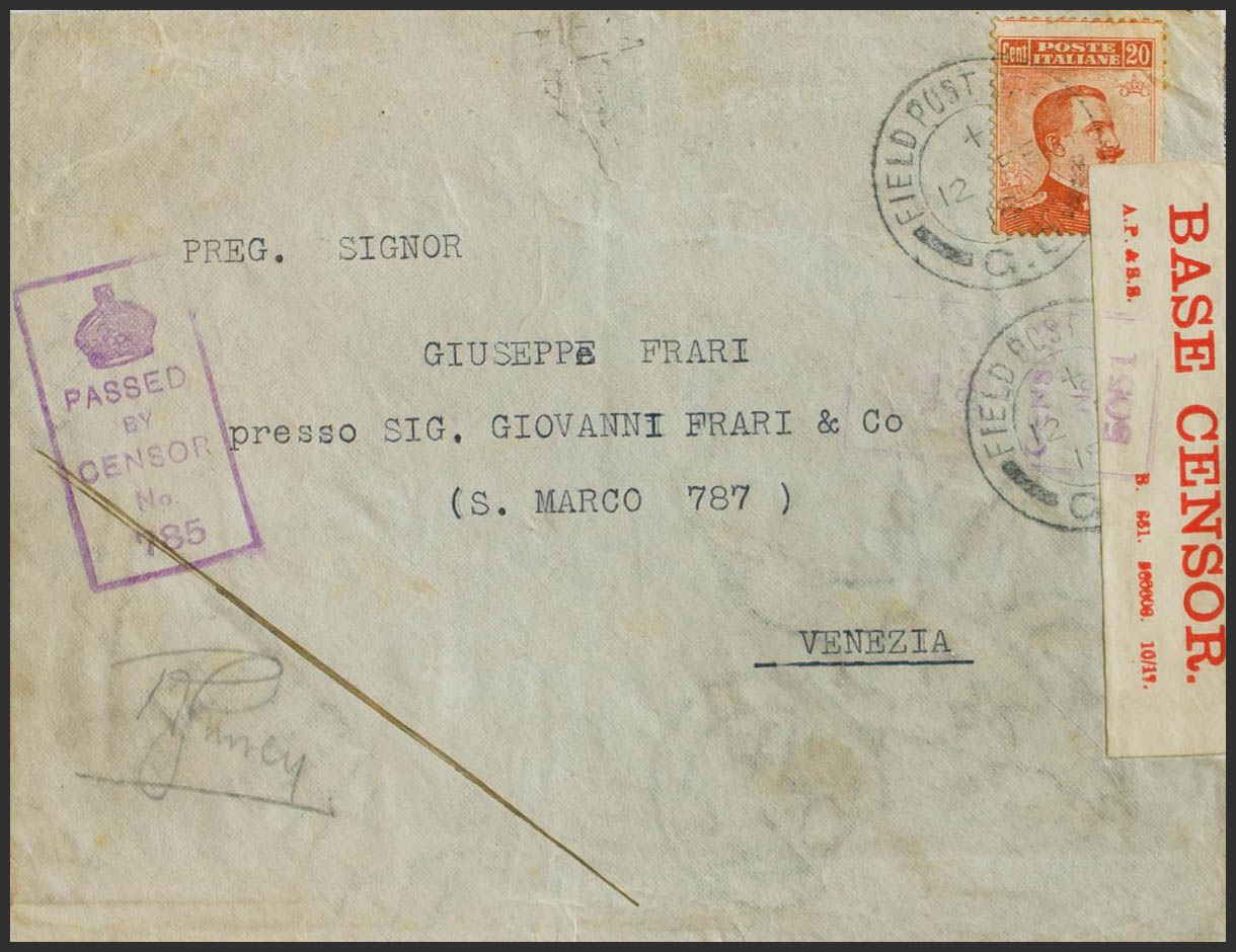 Yvert 105. 1918. 20 cts orange. Addressed to VENICE. British Expeditionary Forces in Italy (BEF) FIELD POST OFFICE / GC postmark and censor marks on the front. MAGNIFICENT AND RARE.