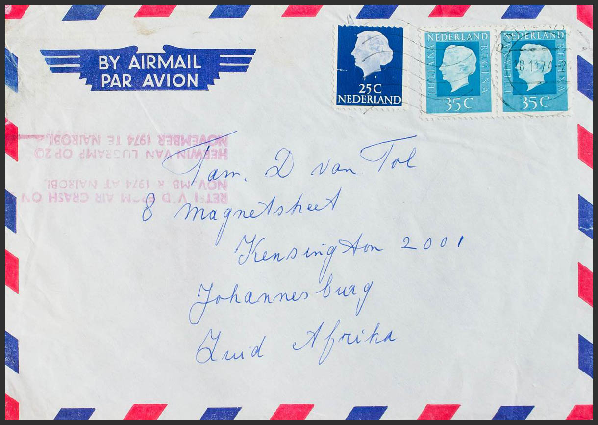 Yvert 603, 945. 1974. 25 cts dark blue and 35 cts blue green, two stamps. Airmail from ROTTERDAM to JOHANNESBURG (SOUTH AFRICA). Lufthansa company plane that covered the GERMANY-SOUTH AFRICA line, crashes shortly after taking off from Nairobi airport, killing 59 passengers. A portion of the mail is retrieved and forwarded to recipients marked RETRIEVED FROM AIR CRASH ON 20 / NOVEMBER 1974 AT NAIROBI, in red. MAGNIFICENT AND VERY RARE.