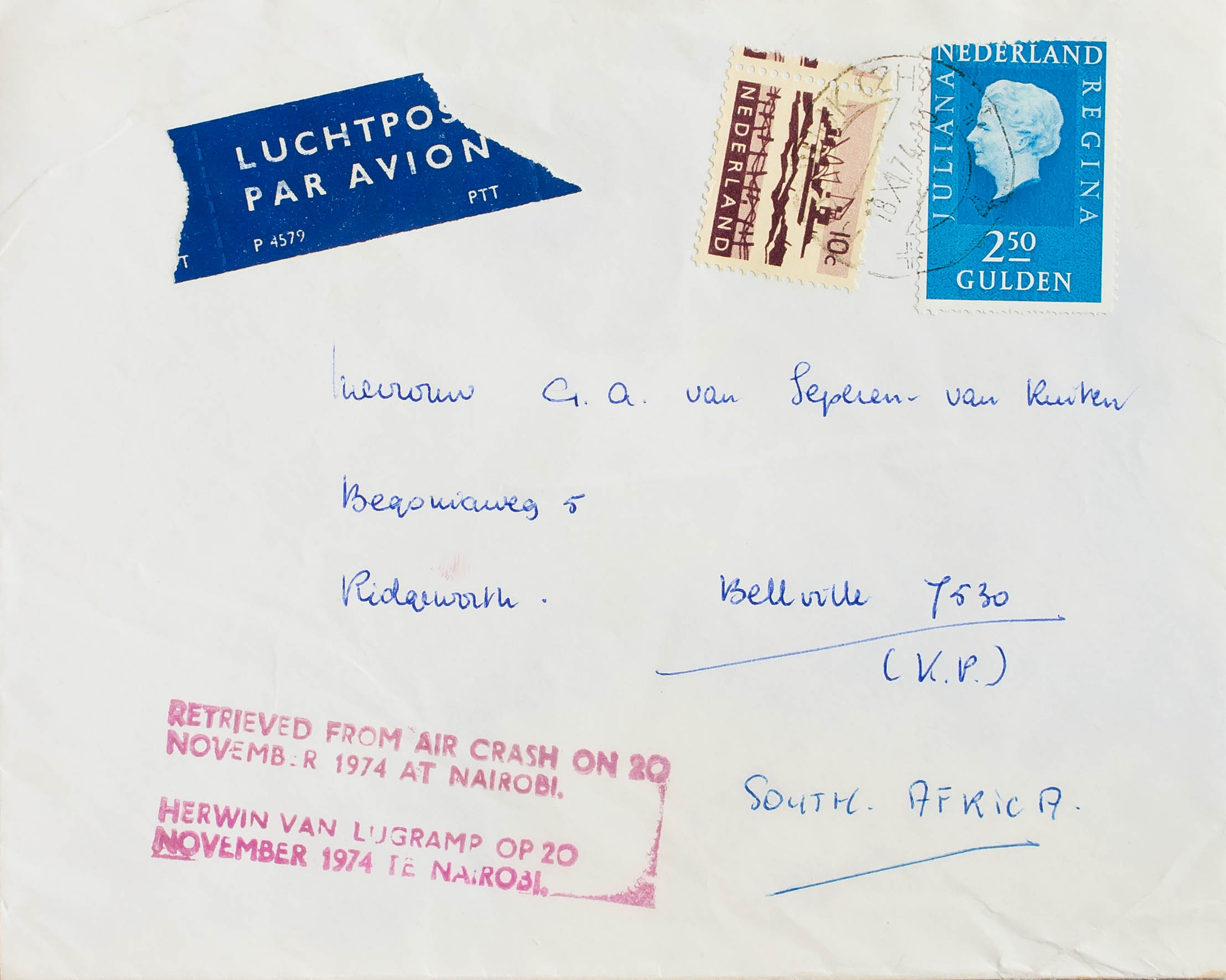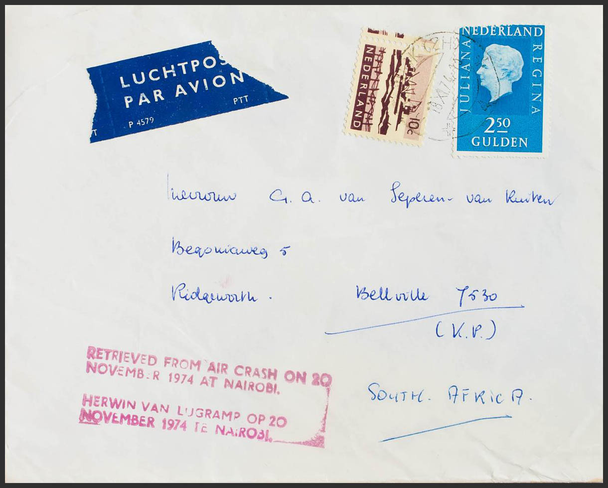 Yvert 761A, 885. 1974. 10 cts violet and 2.50 g blue green. Air Mail addressed to RIDGEWORT (SOUTH AFRICA). Lufthansa company plane that covered the GERMANY-SOUTH AFRICA line, crashes shortly after taking off from Nairobi airport, killing 59 passengers. A portion of the mail is retrieved and forwarded to recipients marked RETRIEVED FROM AIR CRASH ON 20 / NOVEMBER 1974 AT NAIROBI, in red. MAGNIFICENT AND VERY RARE.