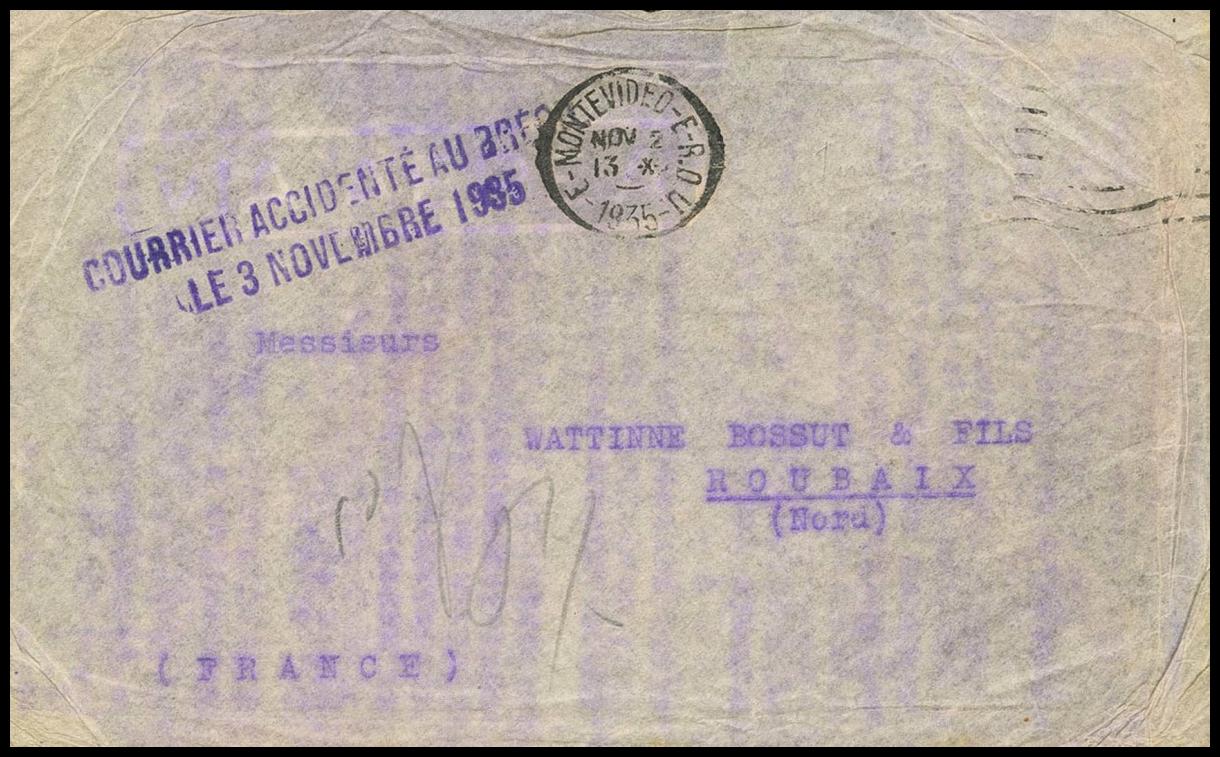 1935. Air Mail from MONTEVIDEO to ROUBAIX (FRANCE). Airplane of the CHILE-FRANCE line (Air France) crashed in Aracaju (Brazil) on November 3, 1935, killing the entire crew. Correspondence recovered on the beach is forwarded to its recipients by applying the COURRIER ACCIDENTE AU BRESIL / LE 3 NOVEMBRE 1935 mark in purple. MAGNIFICENT AND RARE.
