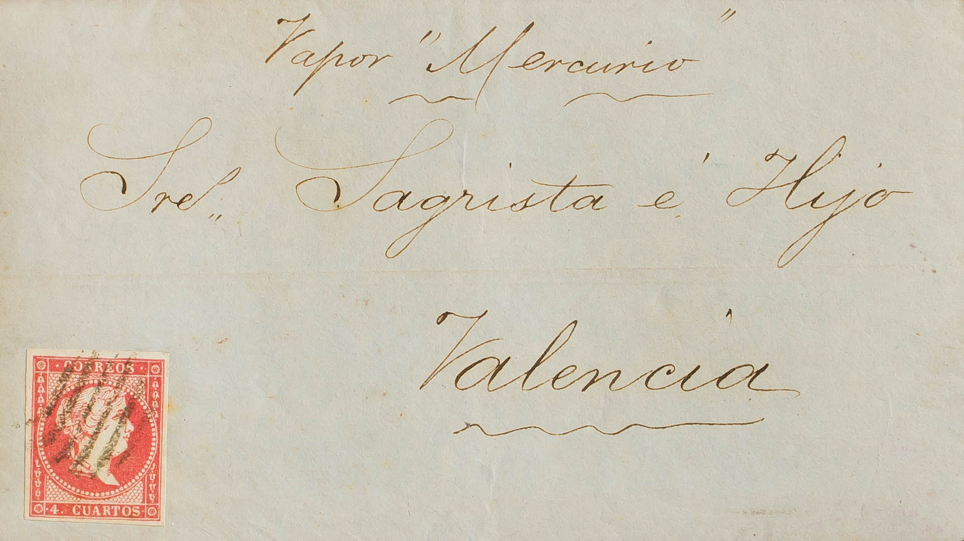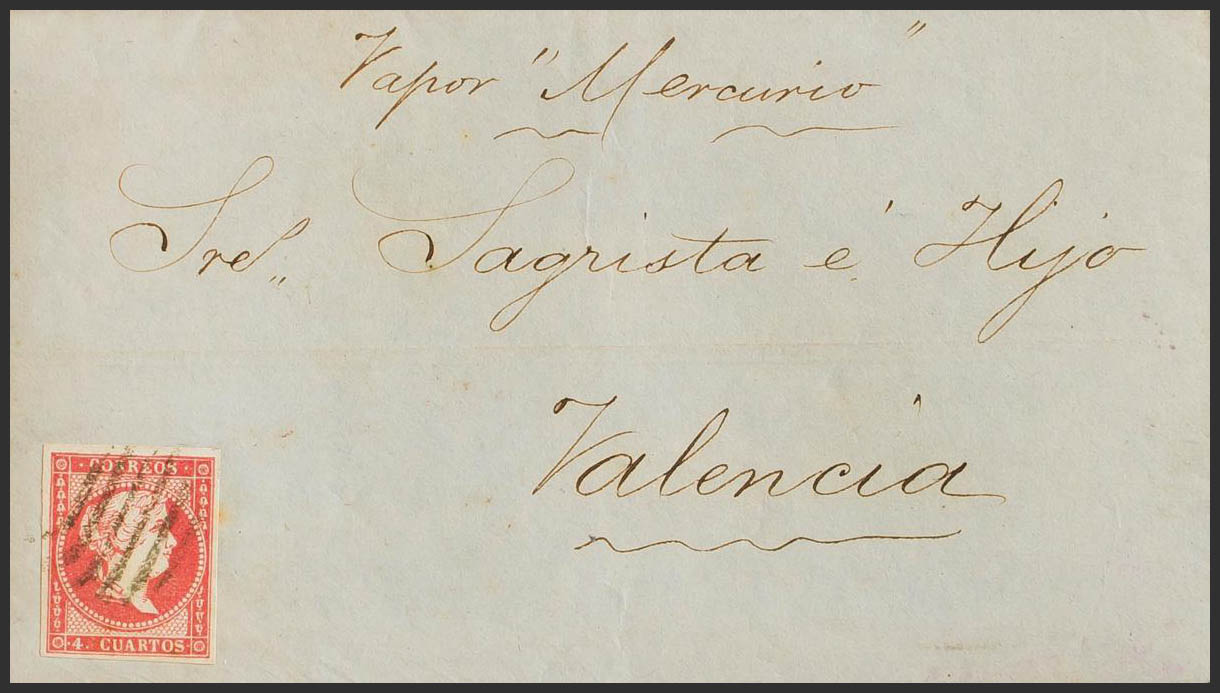 48. 1857. 4 red cuartos . GIBRALTAR to VALENCIA. Manuscript "Steam Mercury". MAGNIFICENT AND UNUSUAL ORIGIN IN THE BRITISH COLONY, AND TRANSPORTED BY THE SPANISH MAIL, AS HAPPENED IN MANY OF THE OCCASIONS WHERE THE DESTINATION OF THE MISSIVE WAS SPANISH TERRITORY.