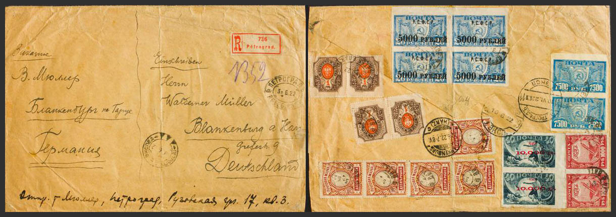 Yvert 128(5), 149(2), 162(4), 163(2). 1922. Various values of different issues (franked on the back). PETROGRADE certificate to BLANKENBURG (GERMANY). On the back transits and arrival. MAGNIFICENT AND SPECTACULAR POSTAGE OF THE INFLATION PERIOD.