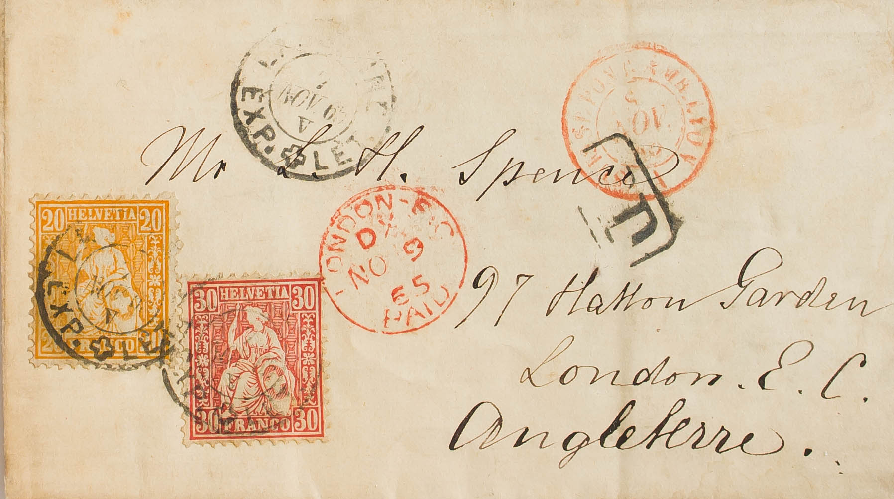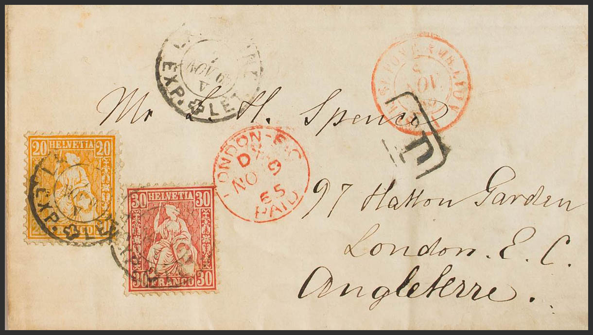 Yvert 37, 38. 1865. 20 cts orange and 30 cts vermilion. LAUSANNE to LONDON. LAUSANNE / EXP+LET postmark, SUISSE PONT date stamp on the front. AMB. LYON, in red. MAGNIFICENT.