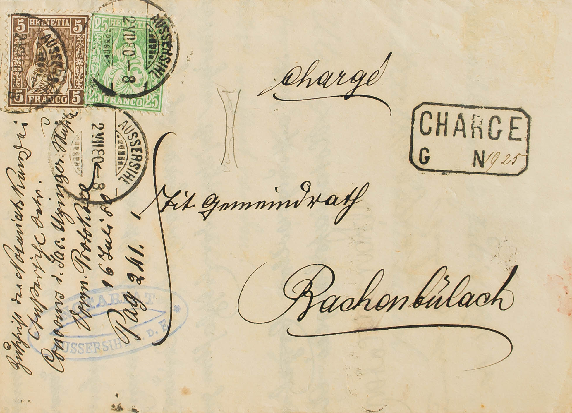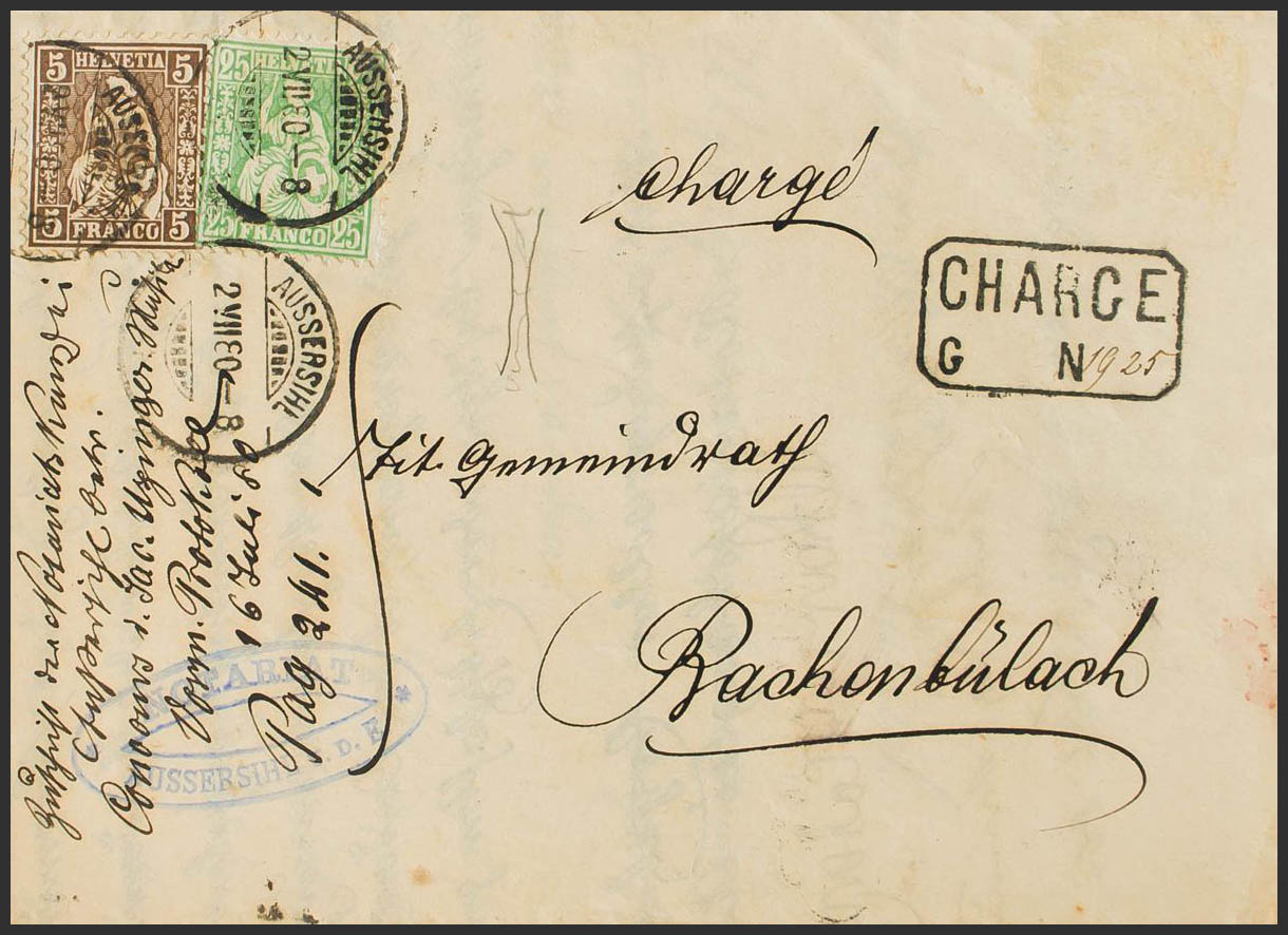 Yvert 35, 45. 1880. 5 cts chestnut and 25 cts green. Certificate from AUSSERSIHL to BACHENBULACH. AUSSERSIHL date postmark and CHARGE mark on the front. MAGNIFICENT.