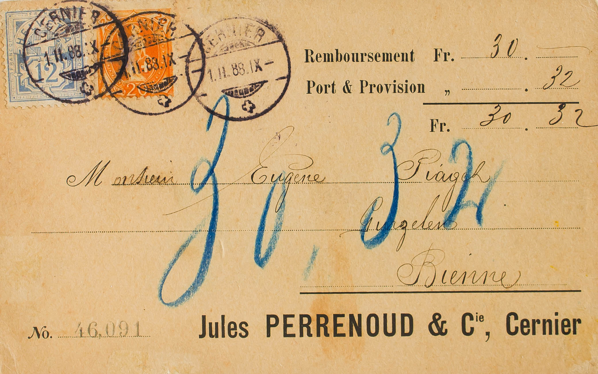 Yvert 68, 71. 1888. 12 cts ultramarine and 20 cts orange. Reimbursement Card from CERNIER to BIENNE. On the back arrival. BEAUTIFUL AND UNUSUAL COMBINATION OF DIFFERENT EMISSIONS.