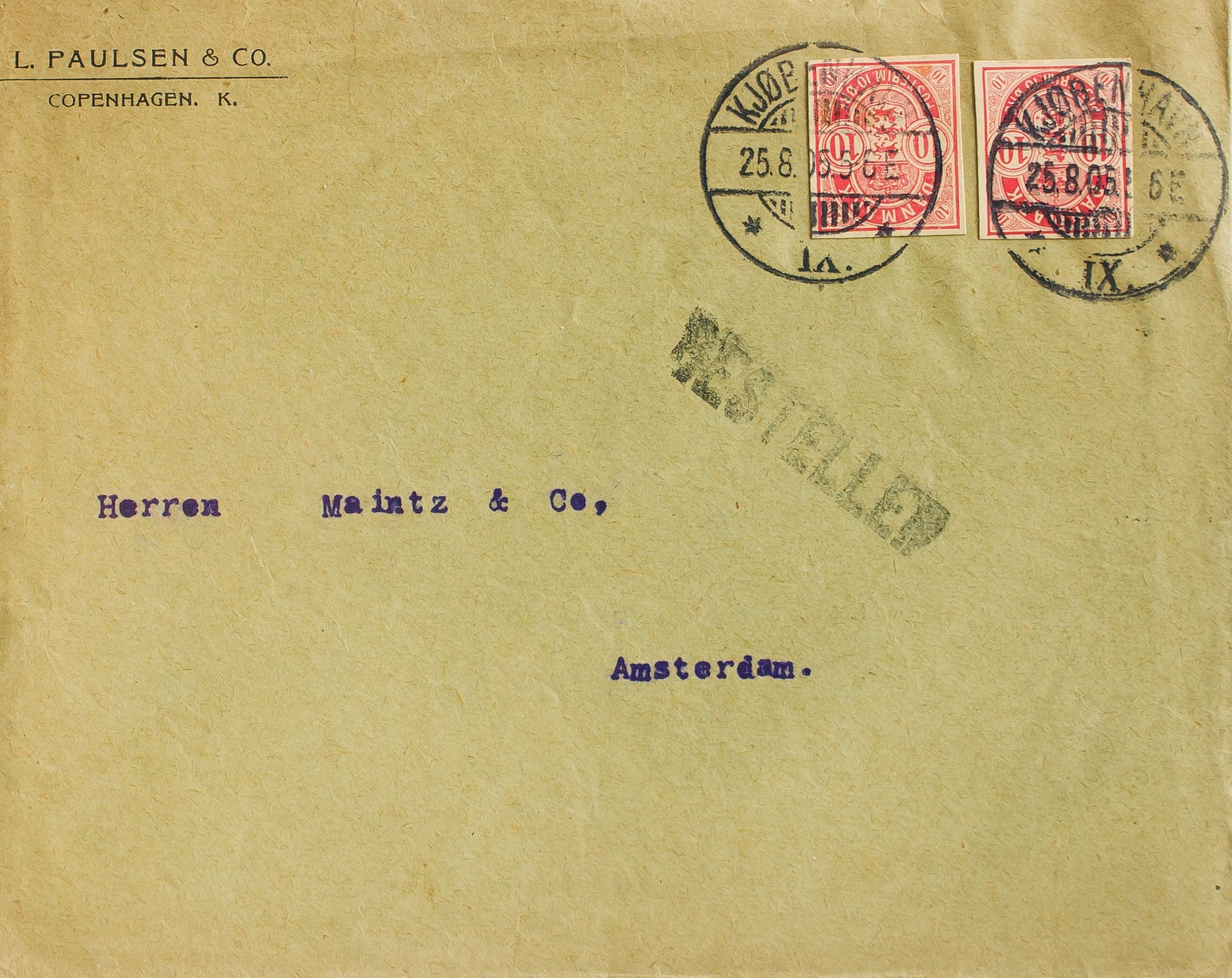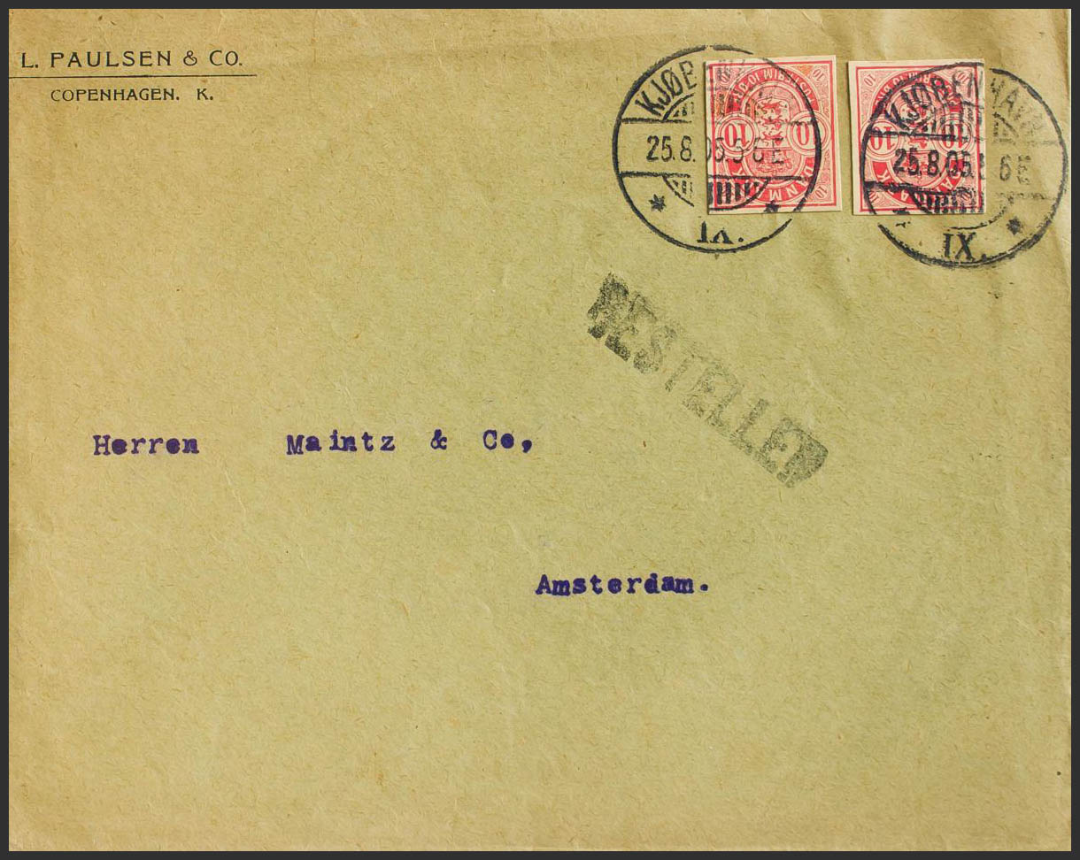 English 1906. 10 ore pink, two stamps from Postal Stationery. COPENHAGEN to AMSTERDAM. On the back arrival. MAGNIFICENT AND RARE USE.