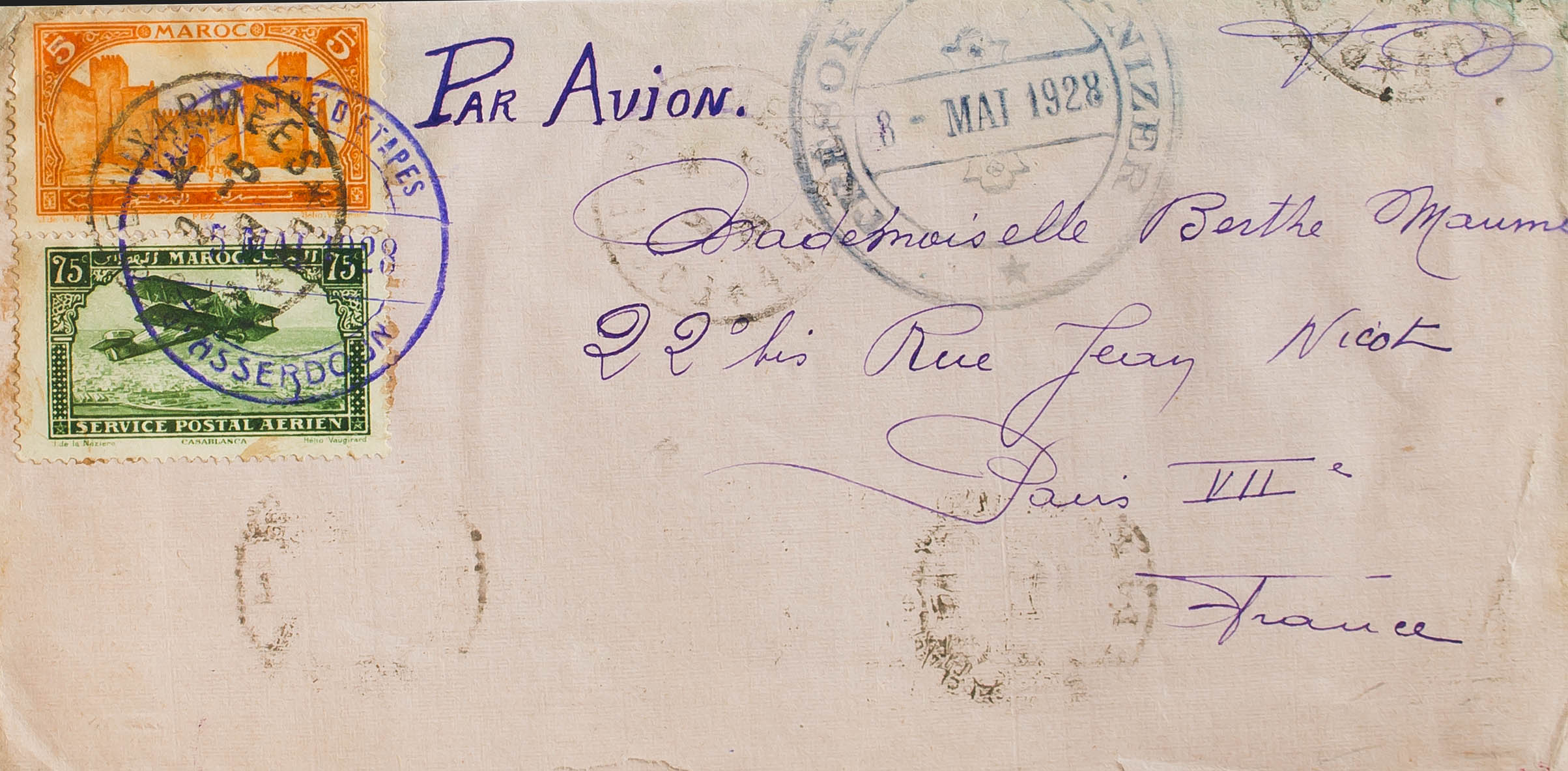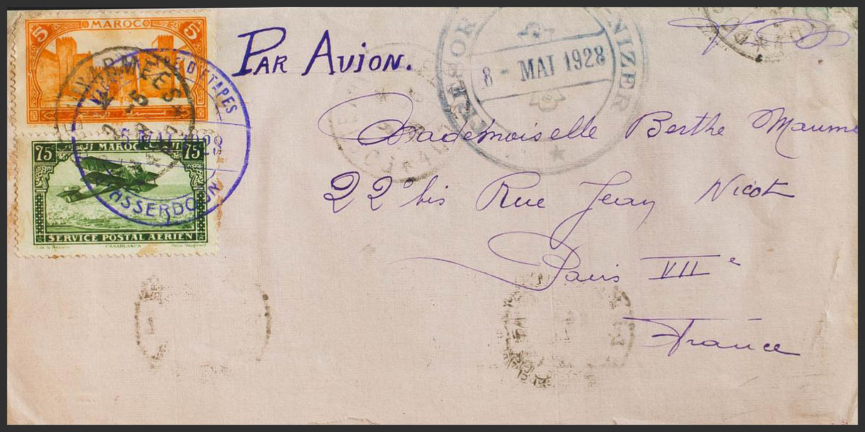 Yvert 101, Aerial 5. 1928. 5 cts orange and 75 cts green. AIN ASSERDOUN to PARIS. POSTES AUX ARMEES postmark and special AIN ASSERDOUN dater, in violet, arrival back. MAGNIFICENT AND RARE.