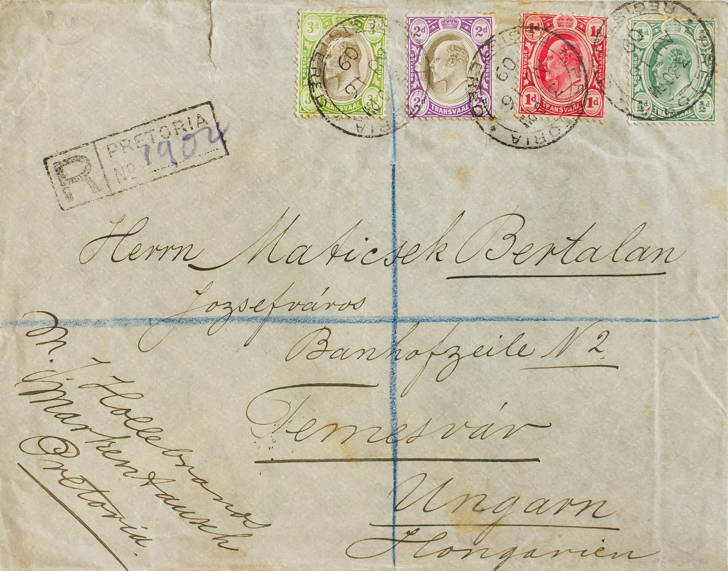 Yvert 166, 168, 177, 178. 1909. 2p violet and grey, 3p green and grey, ½p green and 1p red. Certificate from PRETORIA (SOUTH AFRICA) to TEMESVAR (HUNGARY). Postmark PRETORIA / REGISTERED, arrival back. MAGNIFICENT AND RARE DESTINATION.