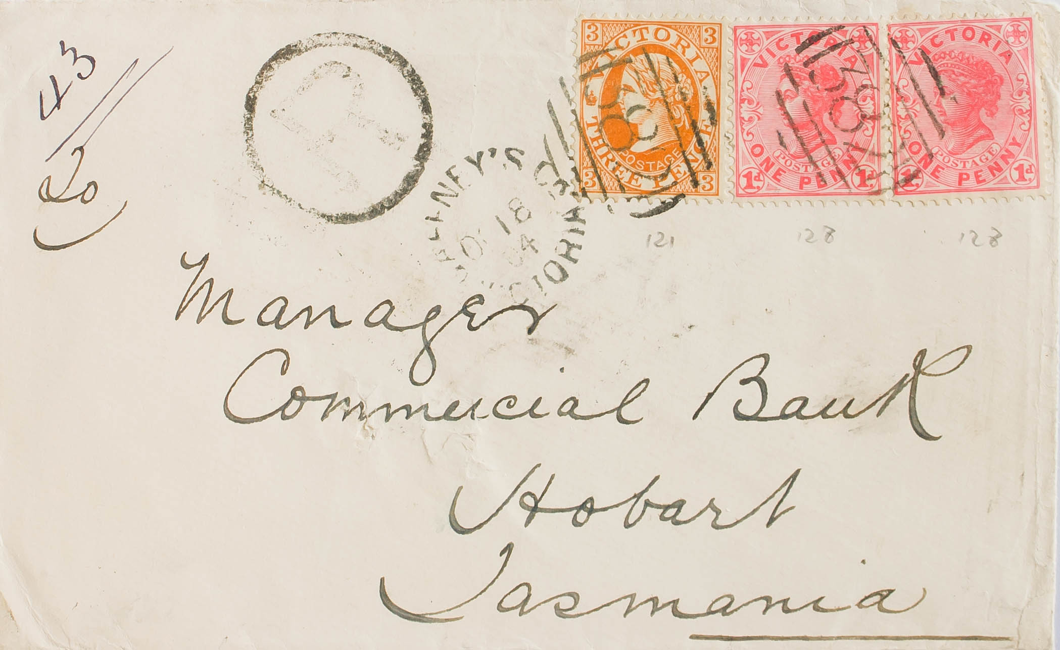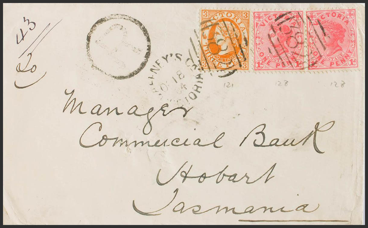 English Yvert 128(2), 132. 1904. 1 p pink, two stamps and 3 p orange. Certificate from GAFFNEY´S CREEK to HOBART (TASMANIA). Postmark numeral "382" and dater GAFFNEY´ Uncirculated / VICTORIA, transits and arrival on the back. MAGNIFICENT AND RARE.