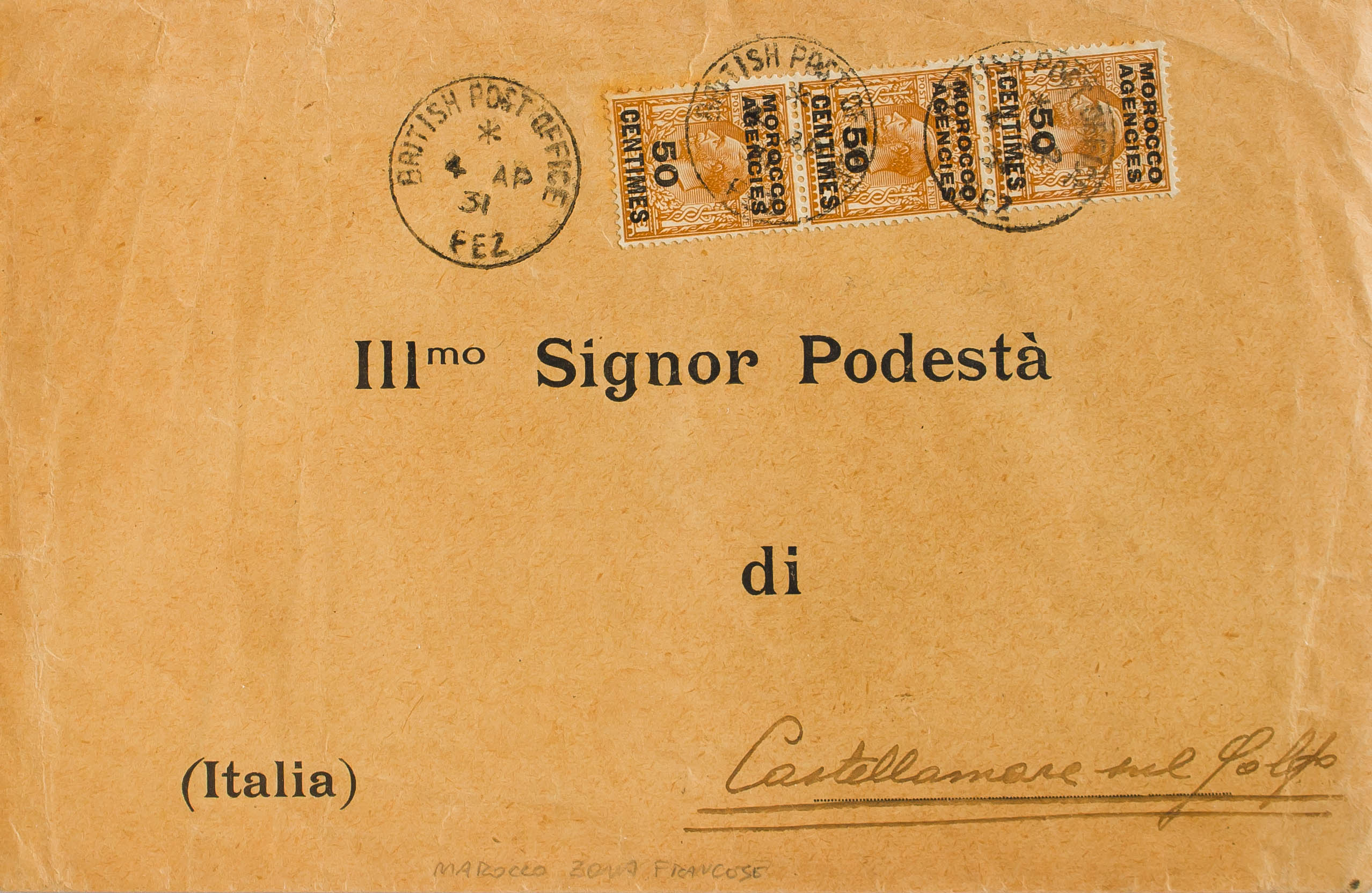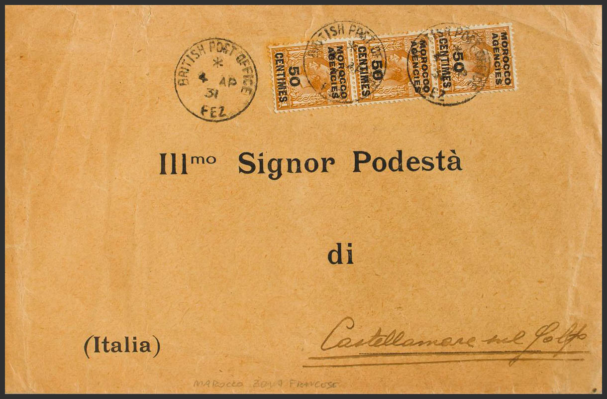 Yvert 17(3). 1931. 50 cts on 5p bistre, strip of three. FES to CASTELLAMARE DEL GOLFO (ITALY). On the back arrival. BEAUTIFUL AND RARE.