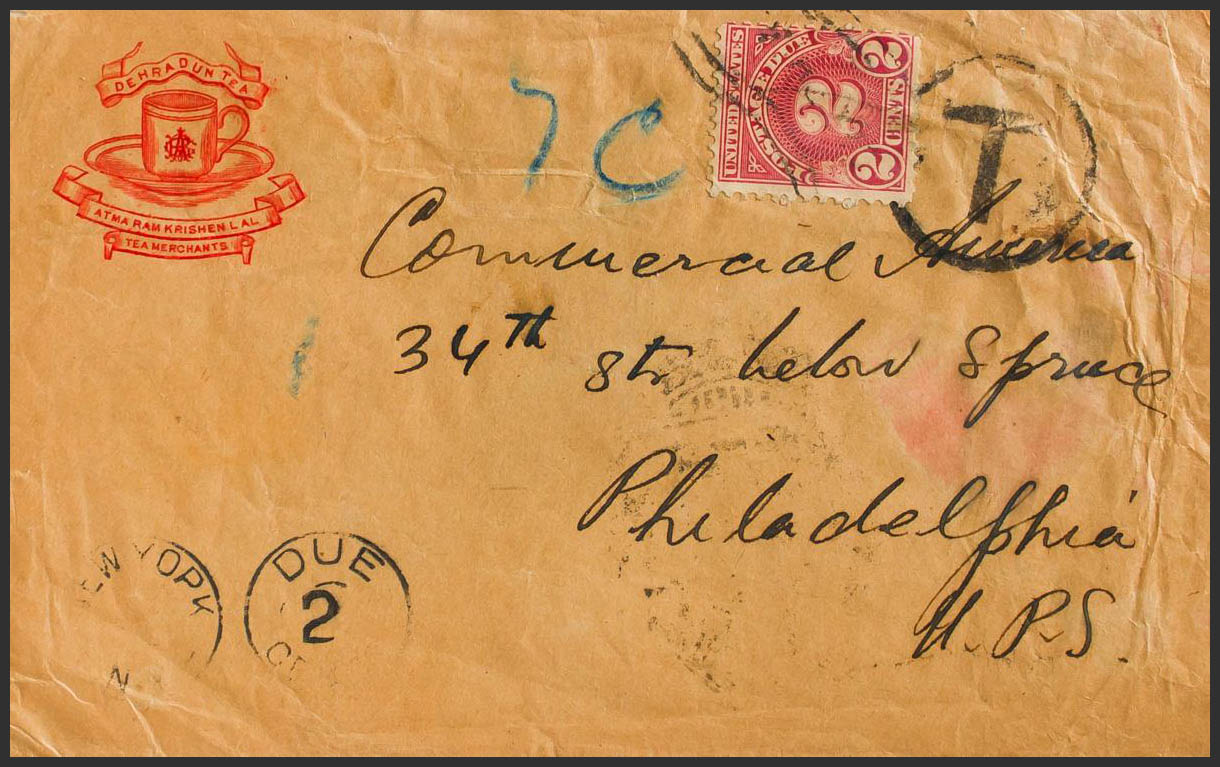 English Yvert 134(3). 1931. 1 to brown, three stamps (back). DEHRADUN to PHILADELPHIA (USA). Valued upon arrival applying red 2 cents US tax stamp. PRETTY.