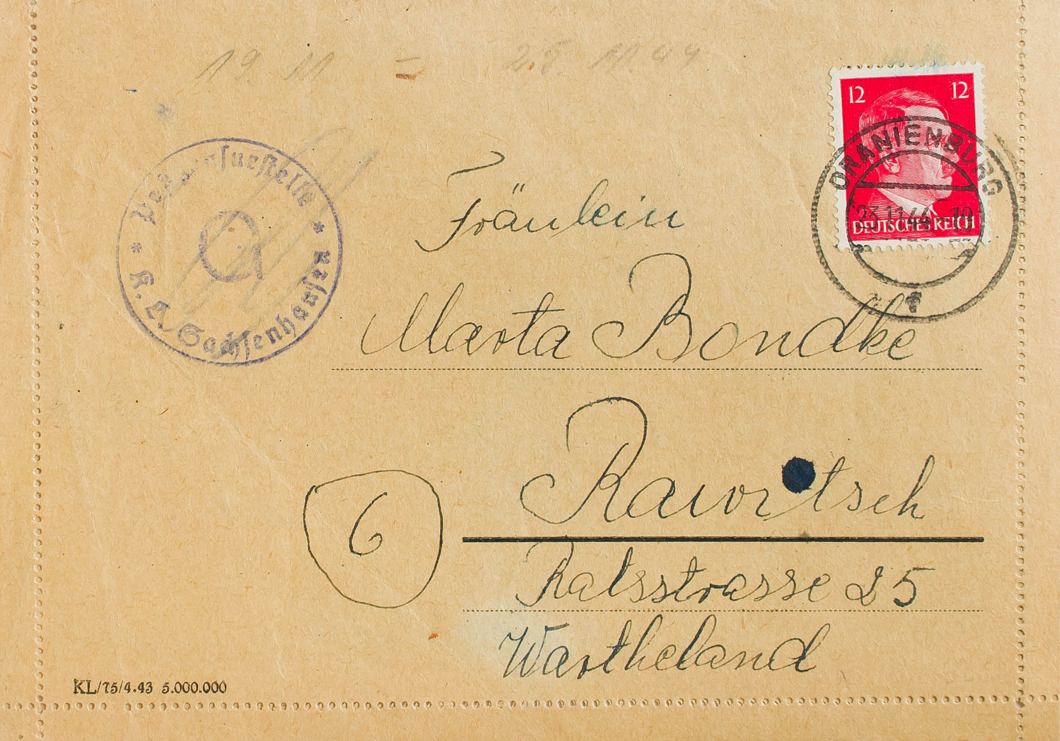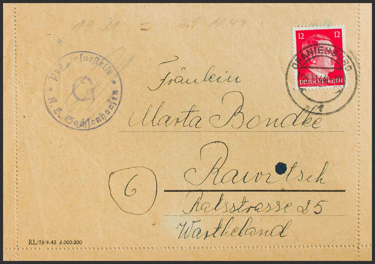 Yvert 713. 1944. 12p red. ORANIENBURG to RAWITSCH (written in the Sachsenhausen camp in full text, French transcript included). MAGNIFICENT.