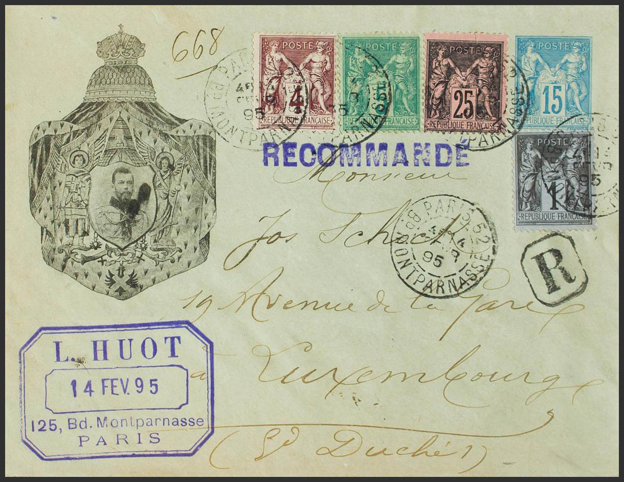 Yvert 75, 83, 88, 97. 1895. 15 cts blue on Uncut Commemorative postcard of Tsar Nicholas II Certificate from PARIS to LUXEMBOURG, with complementary postage of 5 cts green, 1 cts black on blue, 4 cts lilac and 25 cts black on rose. Postmark PARIS 52 / BD. MONTPARNASSE, and on the back arrival. MAGNIFICENT AND SPECTACULAR POSTAGE.