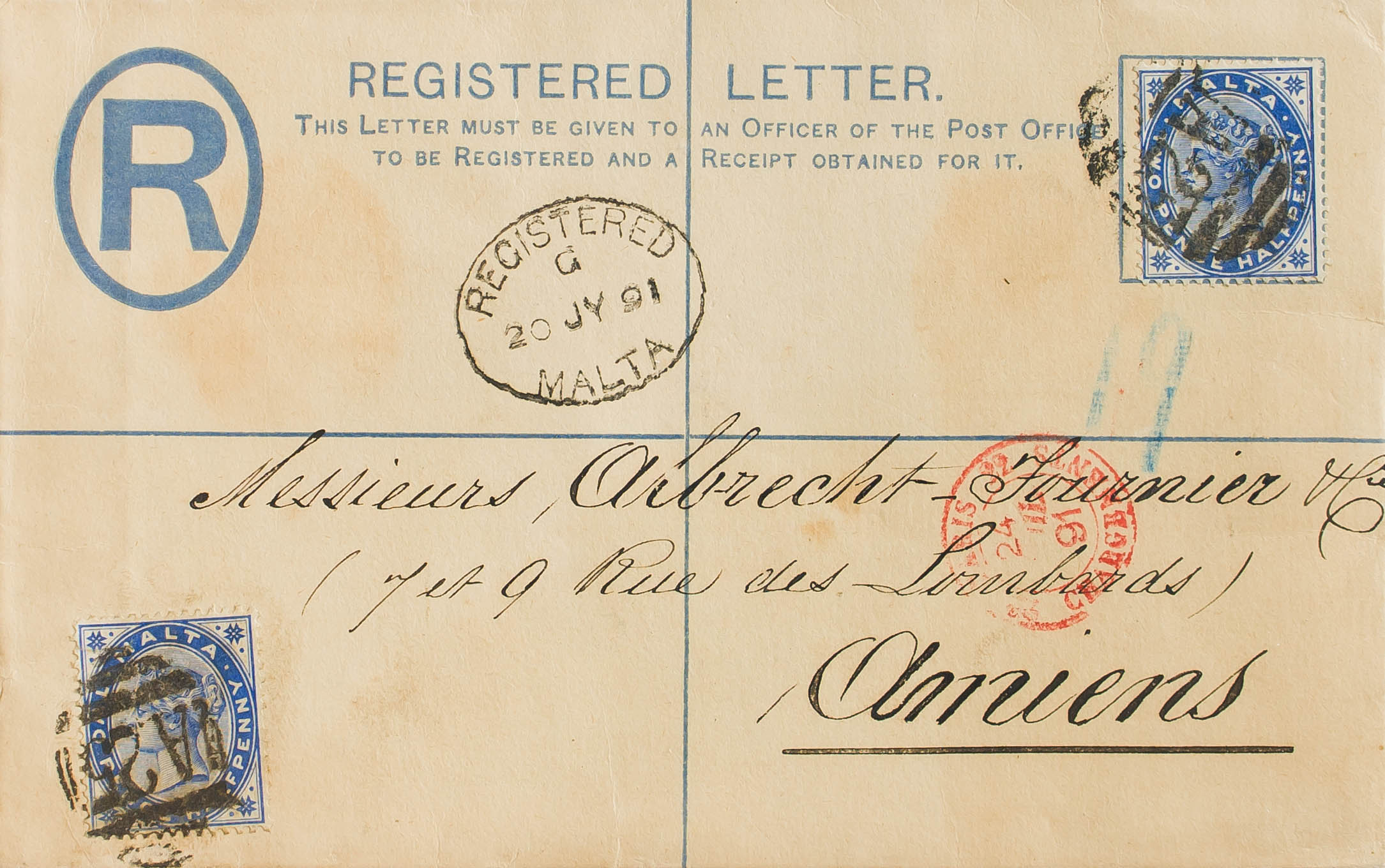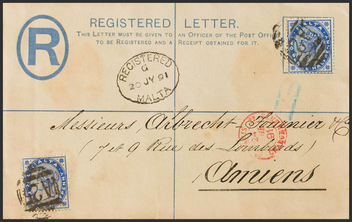 Yvert 8(2). 1891. 2 p blue on Certified Postal Stationery from MALTA to AMIENS (FRANCE), with additional postage of 2 ½ p overseas. On the front date REGISTERED / MALTA and arrival PARIS / CHARGEMENTS. MAGNIFICENT.