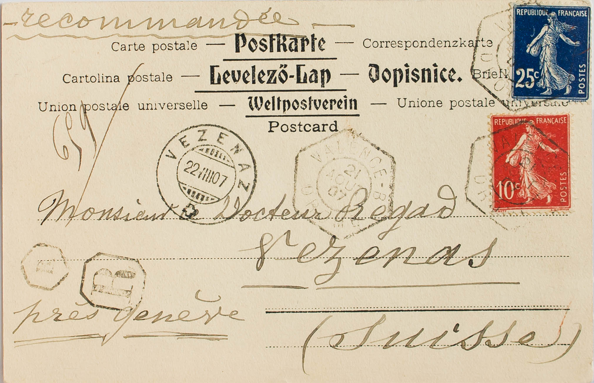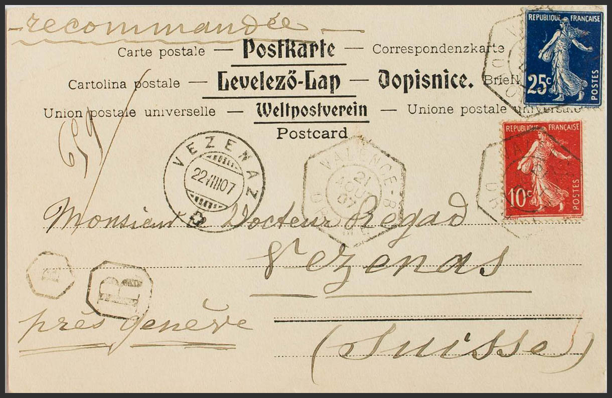 Yvert 135, 140. 1907. 10 cts red and 25 cts dark blue. Certified Post Card from VALENCE to VEZENAS (SWITZERLAND). VALENCE / DROME hexagonal postmark and arrival on the front. MAGNIFICENT.