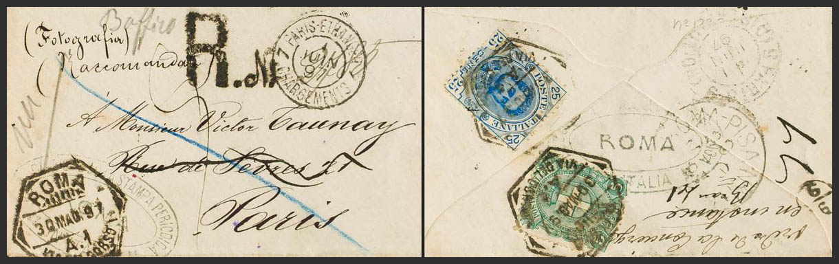 Yvert 57, 61. 1897. 5 cts green and 25 cts blue (frangible on verso). Certificate from ROME to PARIS. various transits. MAGNIFICENT.