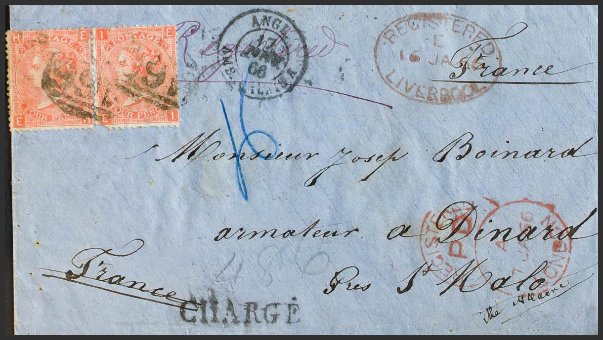 English Yvert 32(2). 1866. 4 p red Plate 7, two stamps (a tooth is missing in one corner of one stamp). Certificate from LIVERPOOL to DINARD (FRANCE). On the front REGISTERED / LIVERPOOL date stamps, special double circle REGISTERED / PD / LONDON and CHARGE mark. MAGNIFICENT AND RARE.