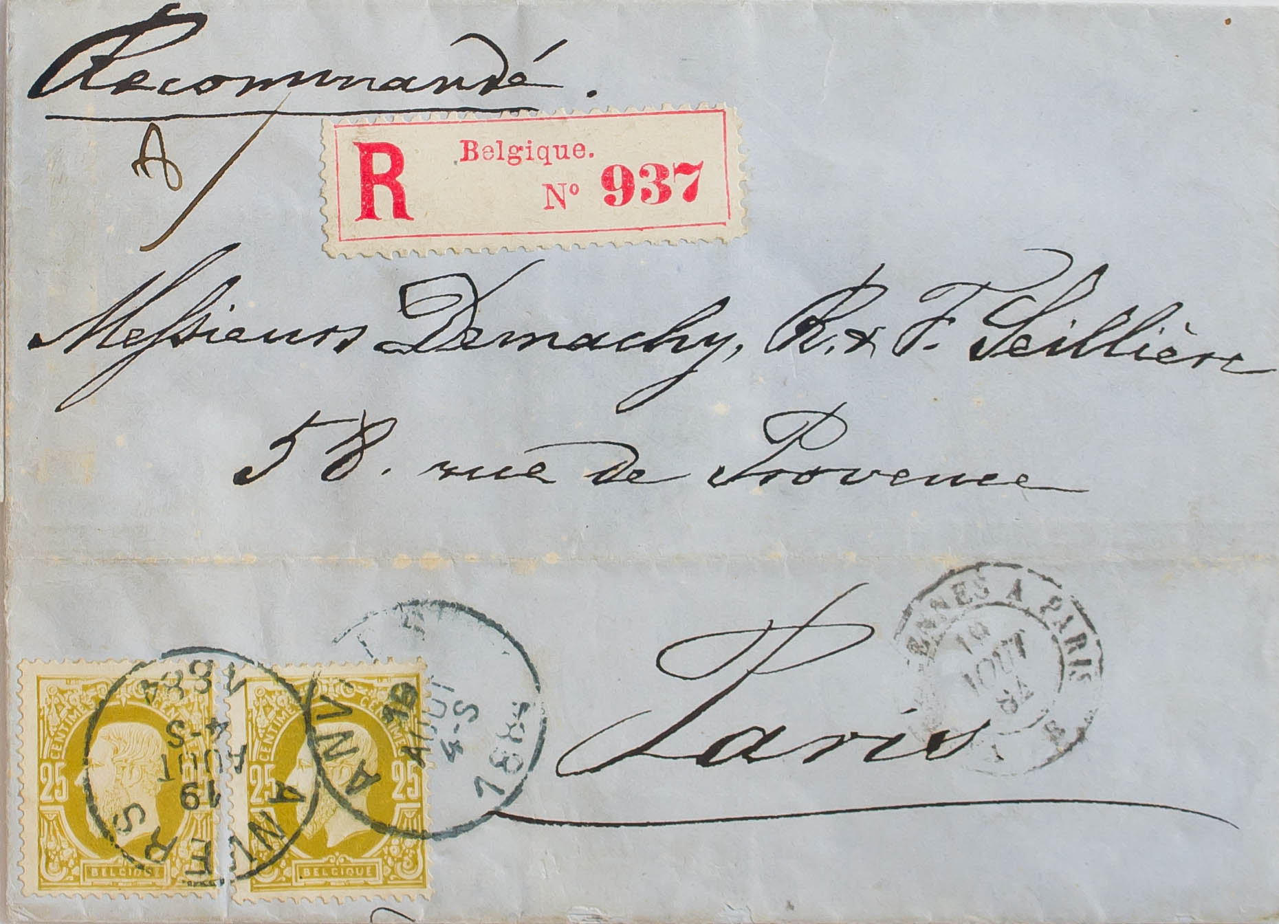 Yvert 32(2). 1869. 25 cts olive, two stamps. Certificate from ANTWERP to PARIS. MAGNIFICENT.